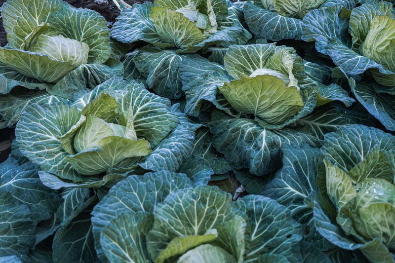 畑で育ったキャベツの収穫時期の写真素材です。結球したキャベツが密集して成長し、淡い緑から濃い緑までの濃淡がある状態で並んでいます。露地栽培された野菜の生育風景を捉えており、農業や野菜の栽培、新鮮食材の紹介、地産地消関連のコンテンツなどにおすすめです。