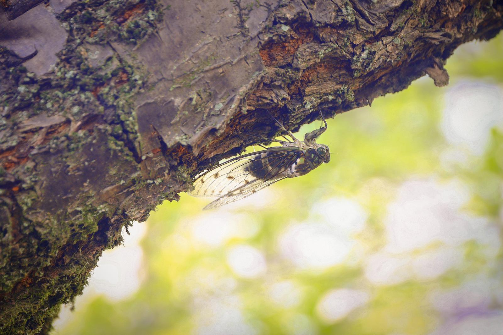 夏の公園で、木の幹の裏側にしがみついているミンミンゼミの写真素材です。苔のついた幹に透明な翅と緑の胴体が写っている。昆虫観察や夏の季節素材として使いやすい一枚。