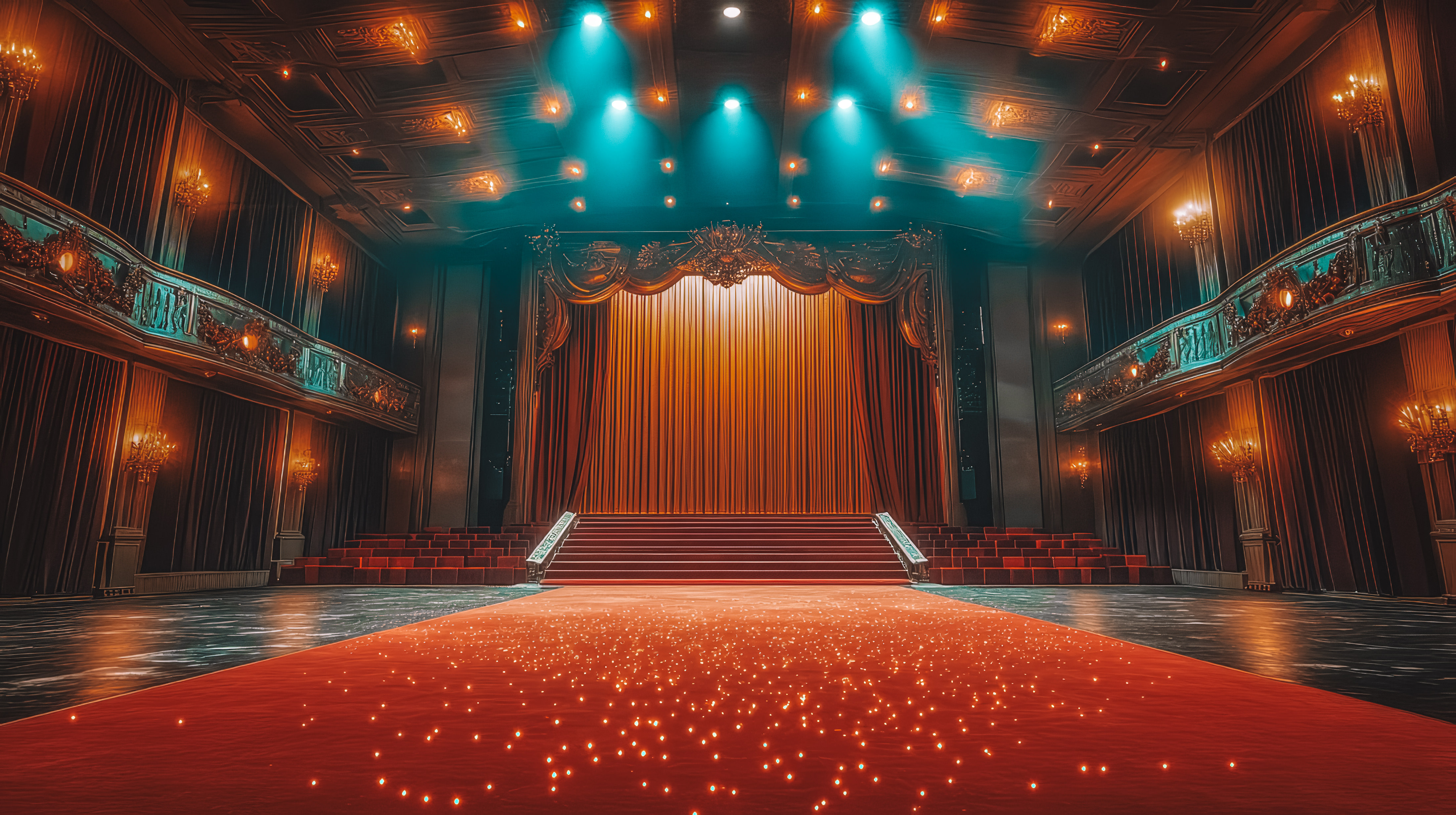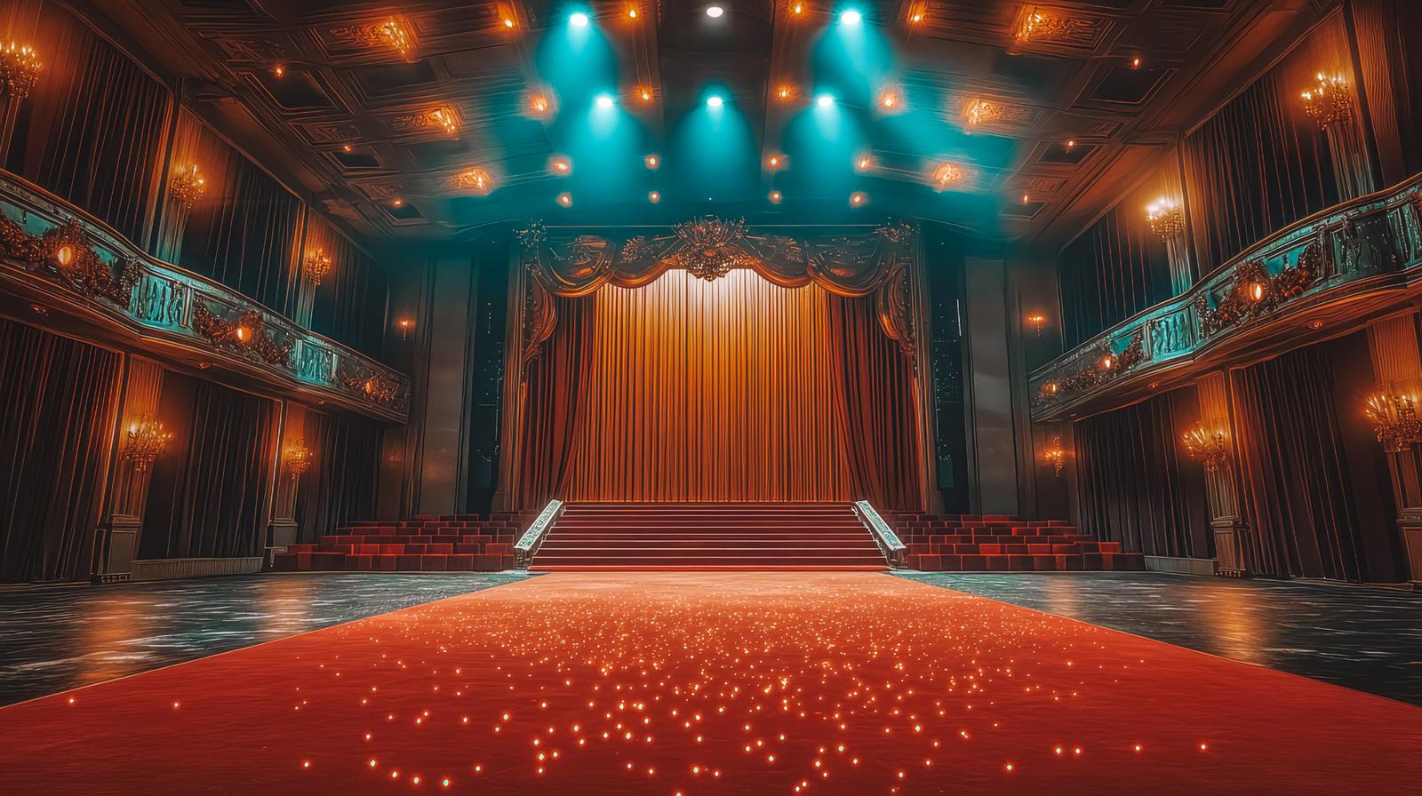 金色の照明装飾とレッドカーペットが敷かれた劇場のステージ