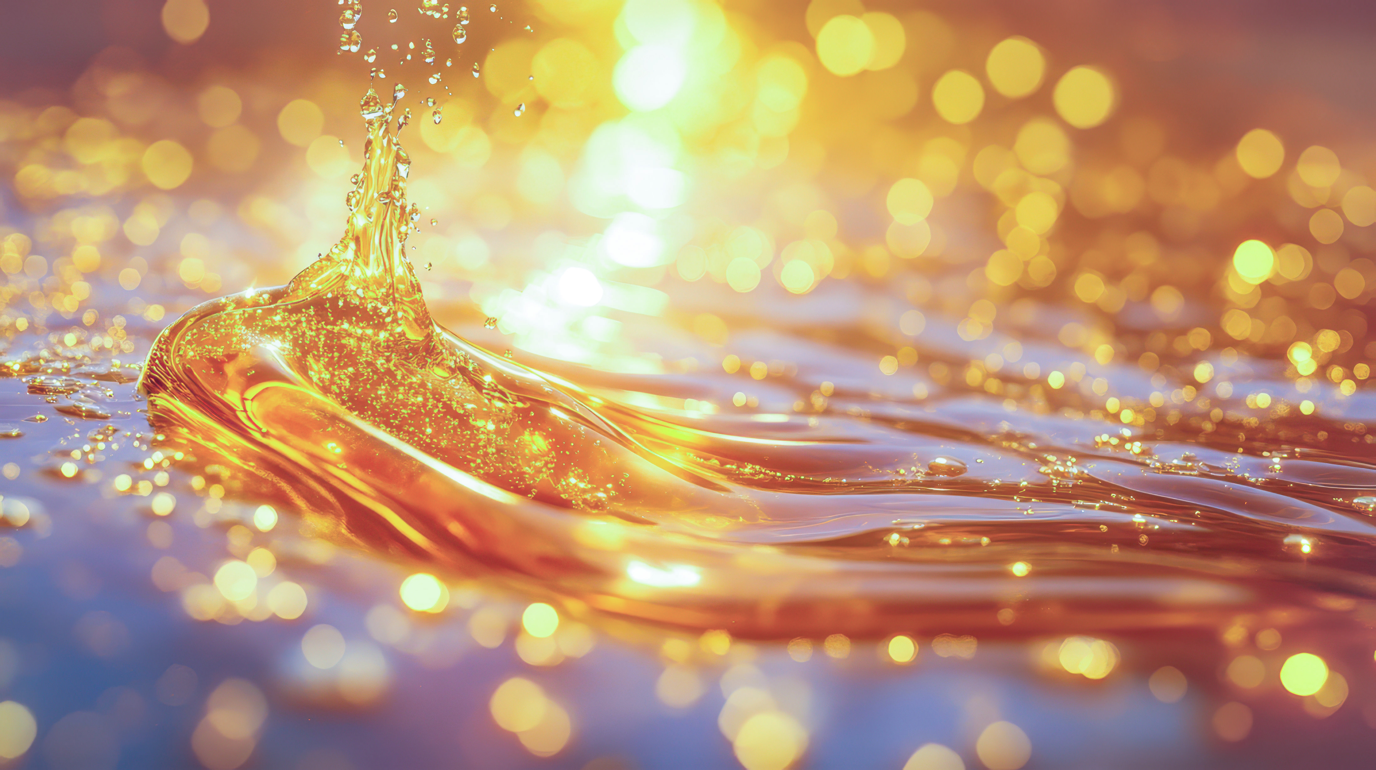 光が踊る黄金のしぶき、煌めく液体の波と粒子のAI画像素材(フリー)