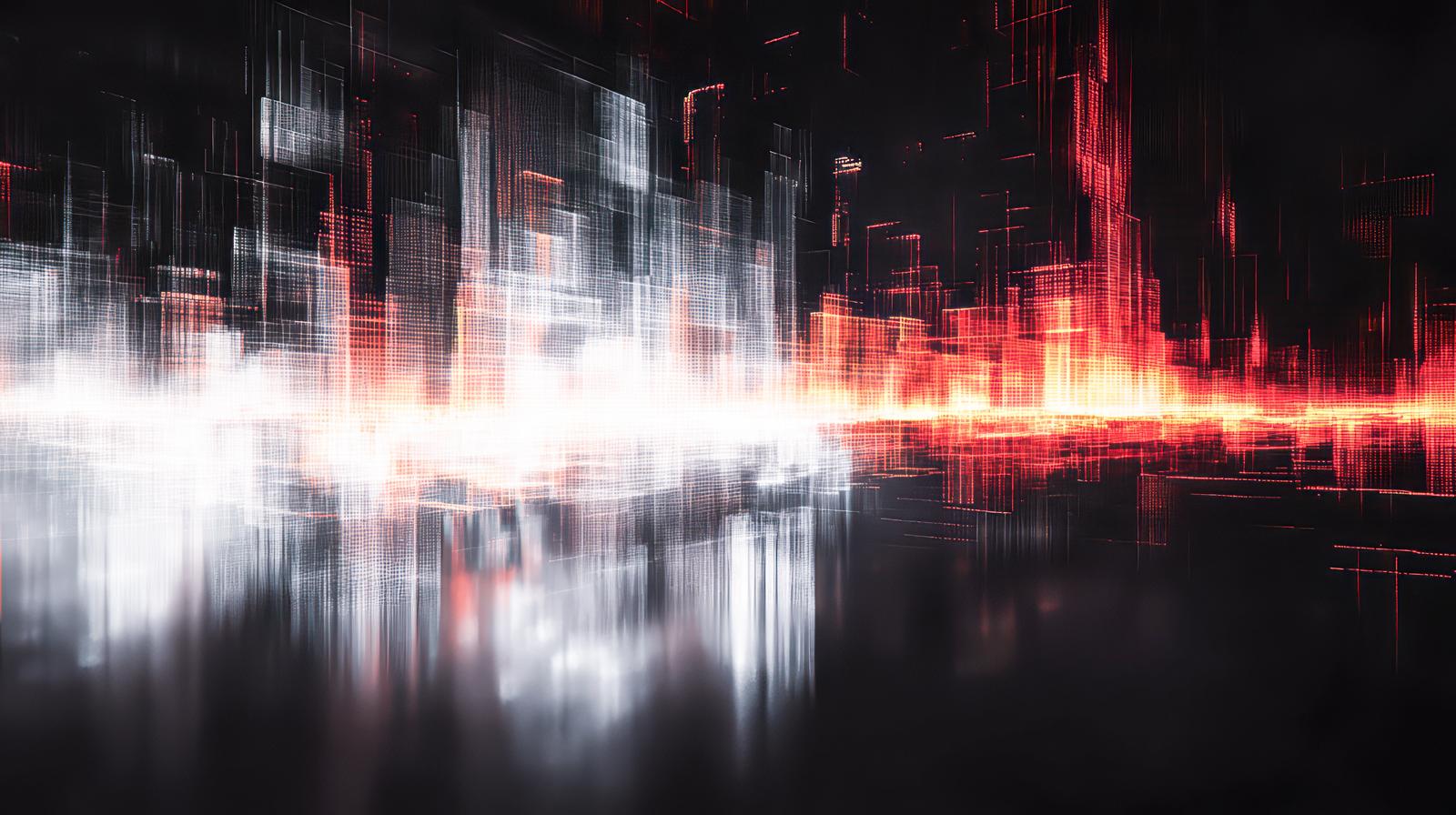 AIで生成した、サイバー空間をイメージしたデジタル抽象の画像素材です。赤い光の帯が画面を横切り、縦のラインが上下に伸びるデジタル構造。テクノロジーやサイバーセキュリティ関連のバナー・プレゼン素材に使えます。