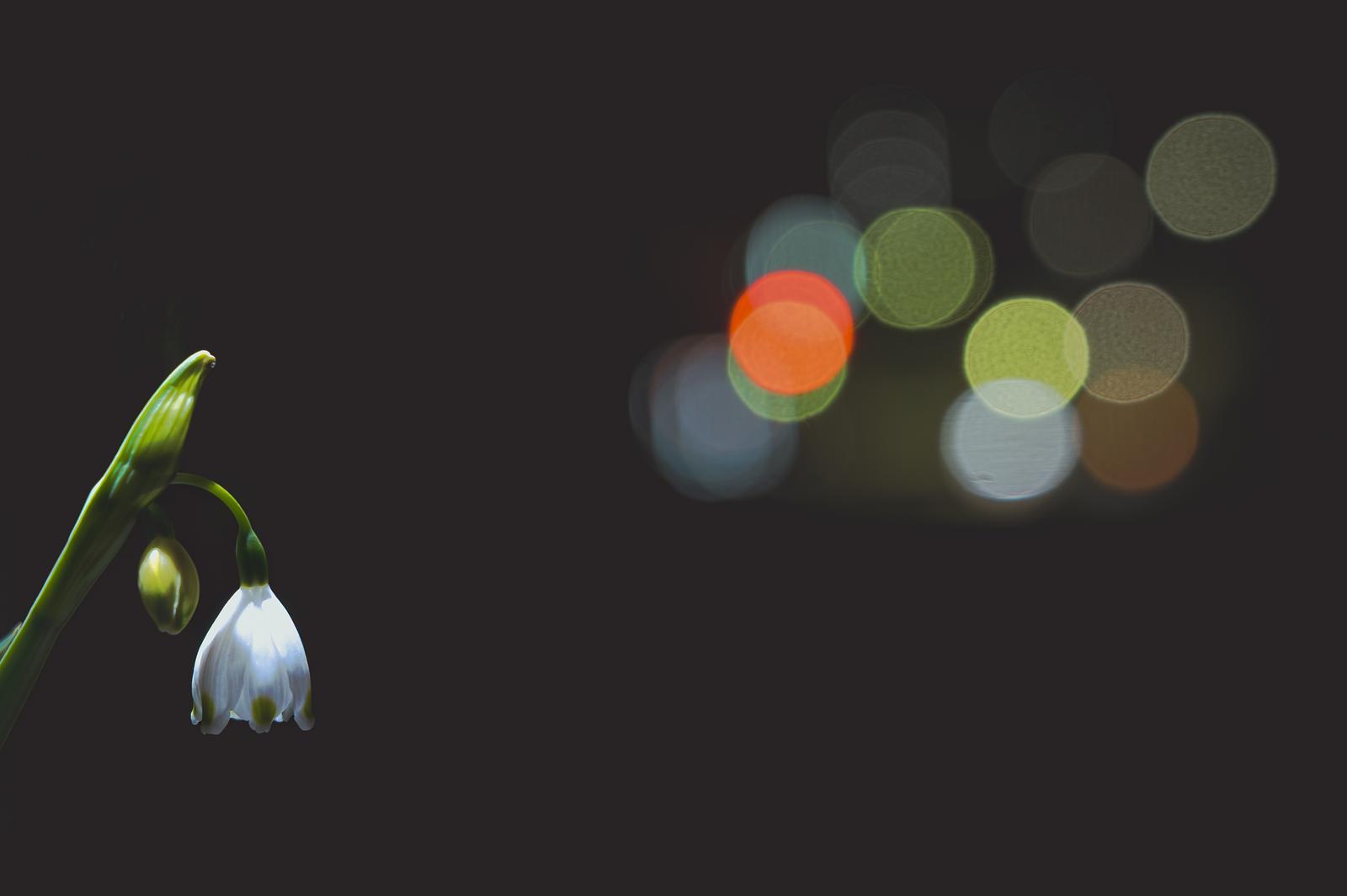 薄暮の中で玉ボケに包まれるスノーフレークの花の写真素材です。白く小さな釣鐘状の花がうつむいて咲き、細い緑の茎があり、背景にはぼんやりとした赤やクリーム色の玉ボケが浮かんでいます。夕方から夜間の花撮影や、季節感のある素材、落ち着いた雰囲気のデザインなどにおすすめです。