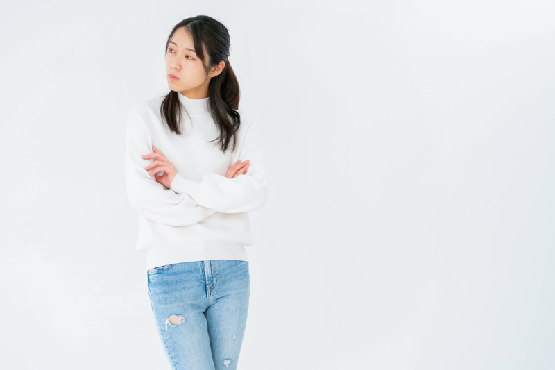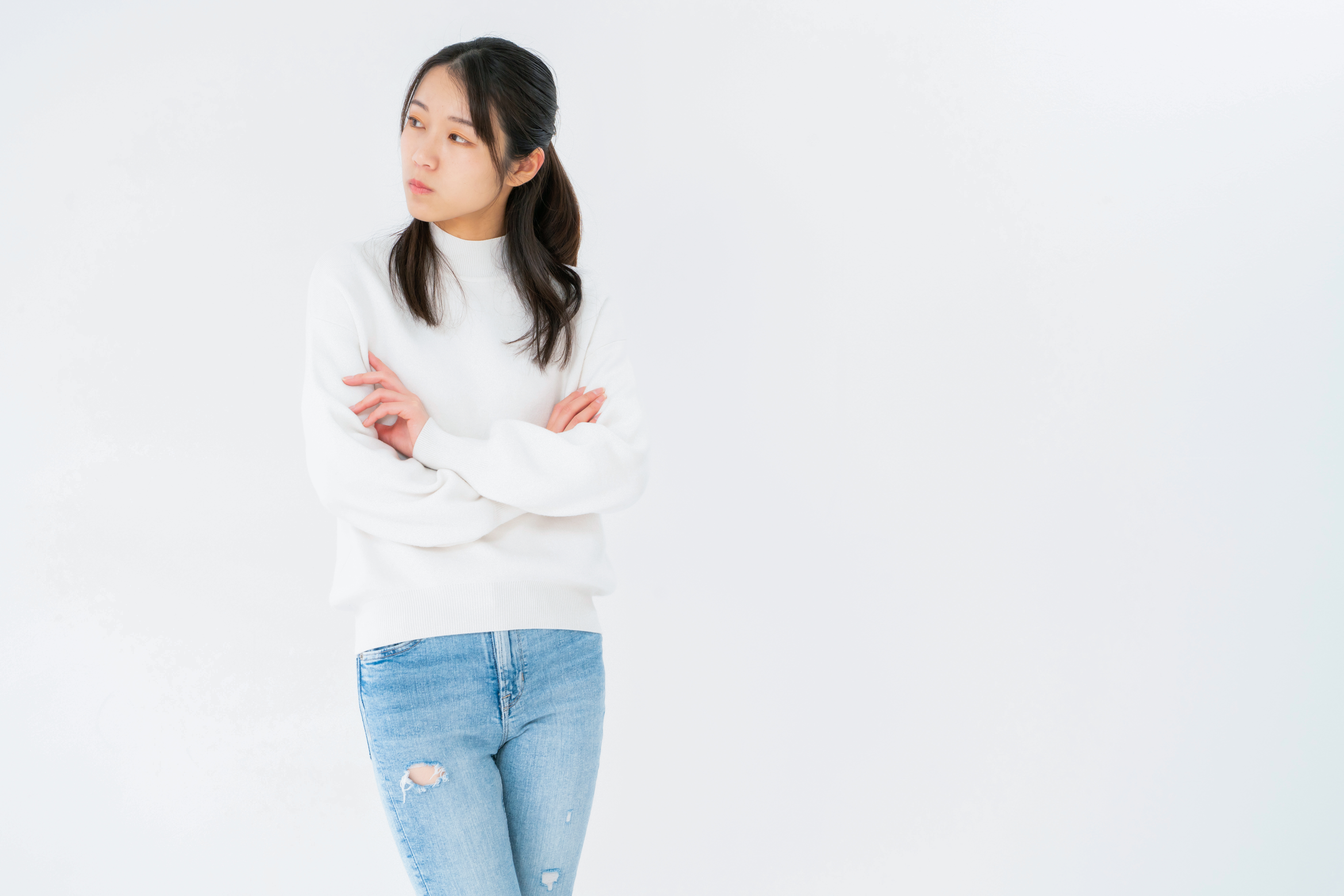 腕を組んでそっぽを向く女性の写真素材です。白いロングスリーブのシャツを着た女性が、両腕を胸の前で組み、視線を左下に向けて立つ、不機嫌で拗ねた表情を表現しています。ポーズ集や感情表現、Webサイト、SNS、デザインテンプレートなどにおすすめです。