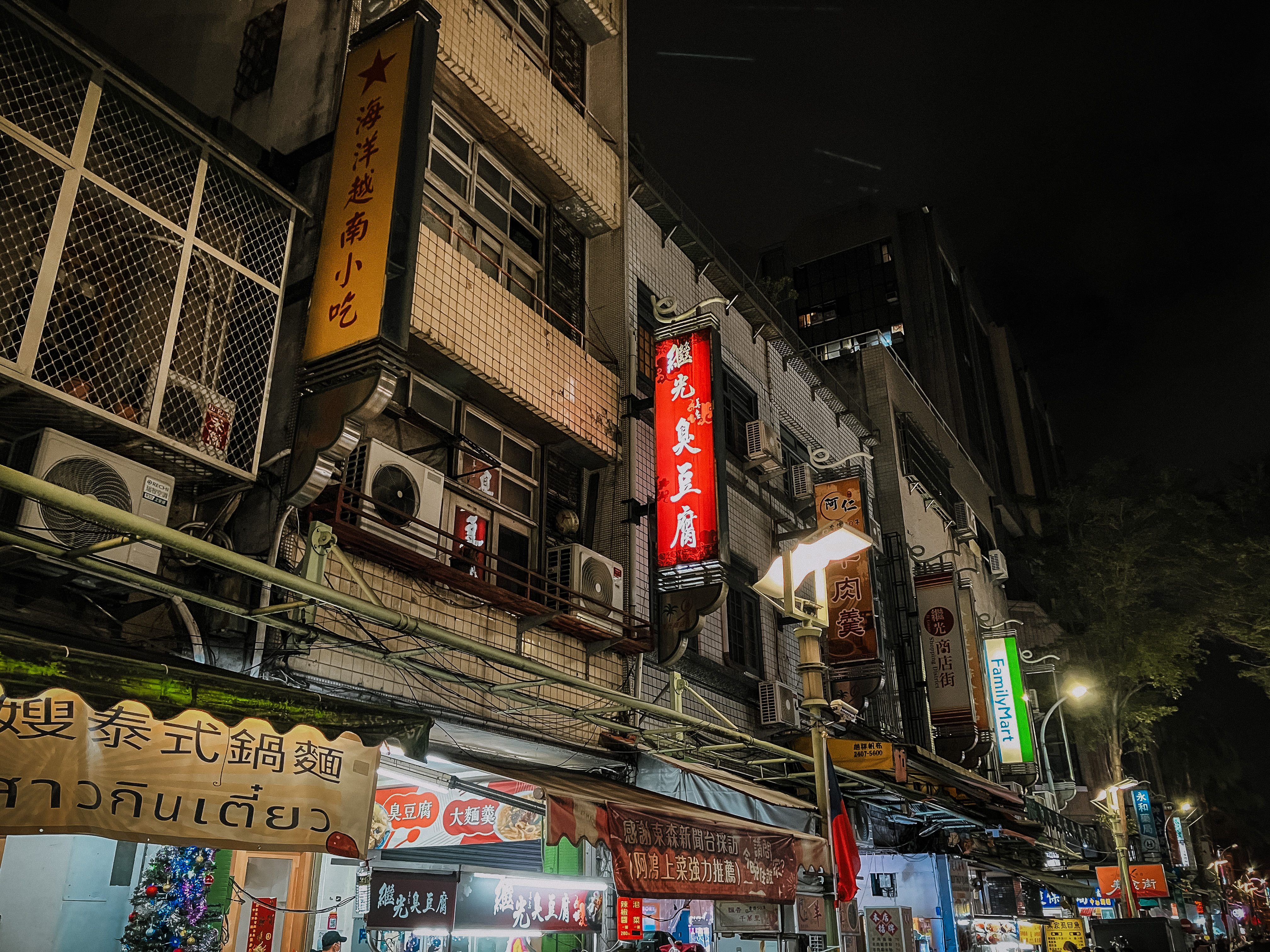 ネオンが灯る台湾の屋台街の路地裏の写真素材です。黄色や赤色の漢字看板が立ち並び、複数の店舗のネオン照明が点灯、エアコン室外機が設置された景観が広がります。台湾の屋台文化や夜市の賑わいを表現した素材として、観光地紹介や夜間の町並み、アジアンカルチャーの資料に活用できます。
