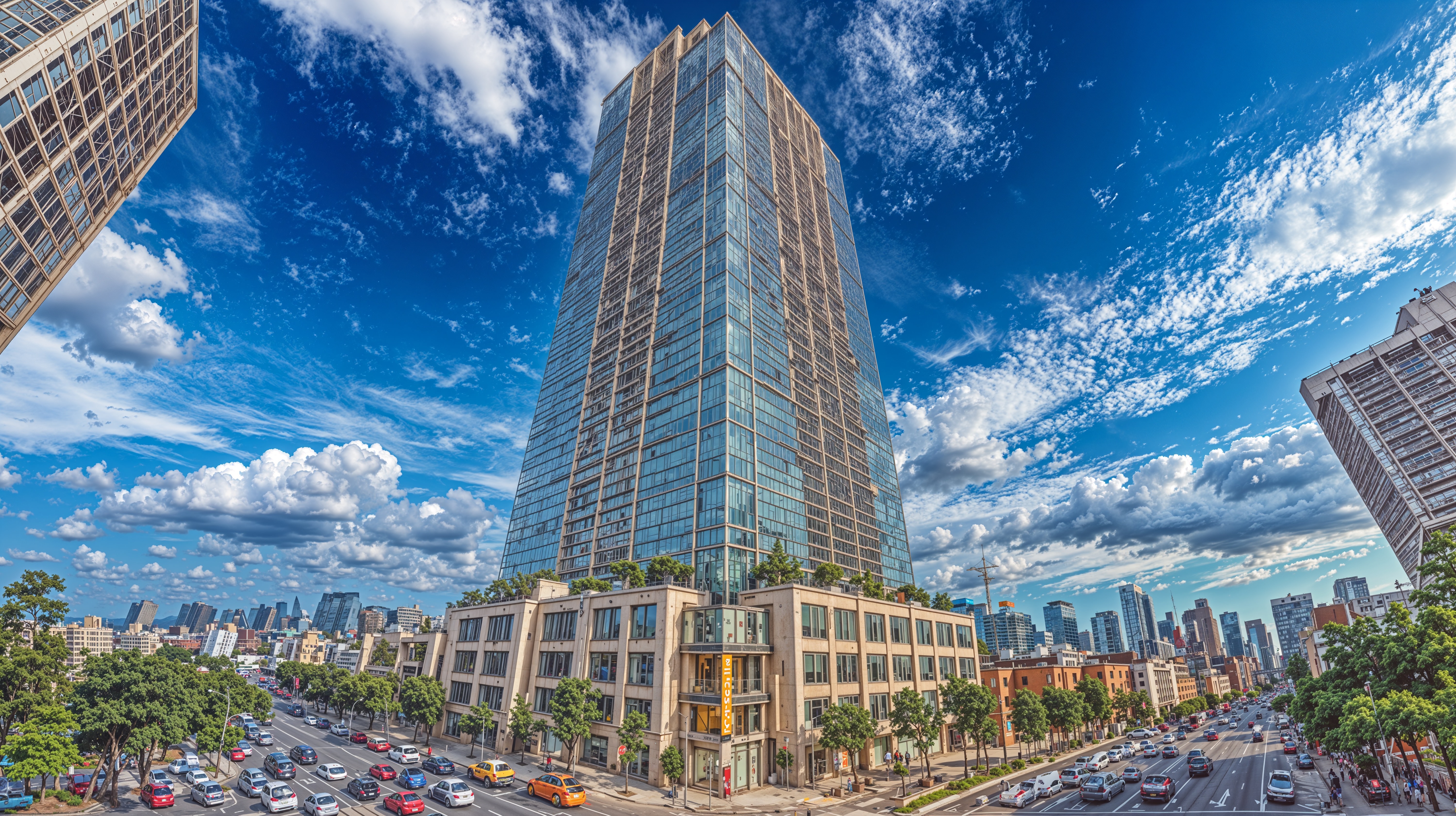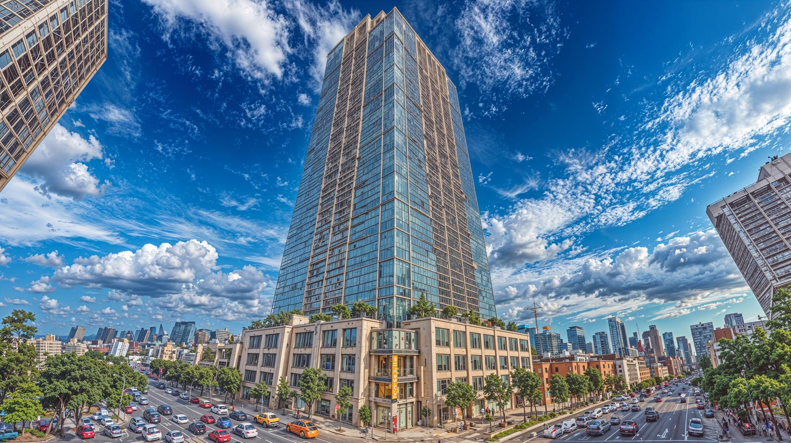 AIで生成した高級タワーマンションの画像素材です。中央に立つ高層ビルは淡いベージュ色の外壁と規則的な窓配列を備え、両側には異なる建築様式のビルが配置されています、手前には街路樹が植わった道路を走行する多くの車両が見えます。都市景観、ビジネス関連のデザイン、不動産広告、建築プレゼンテーションなどに活用できます。
