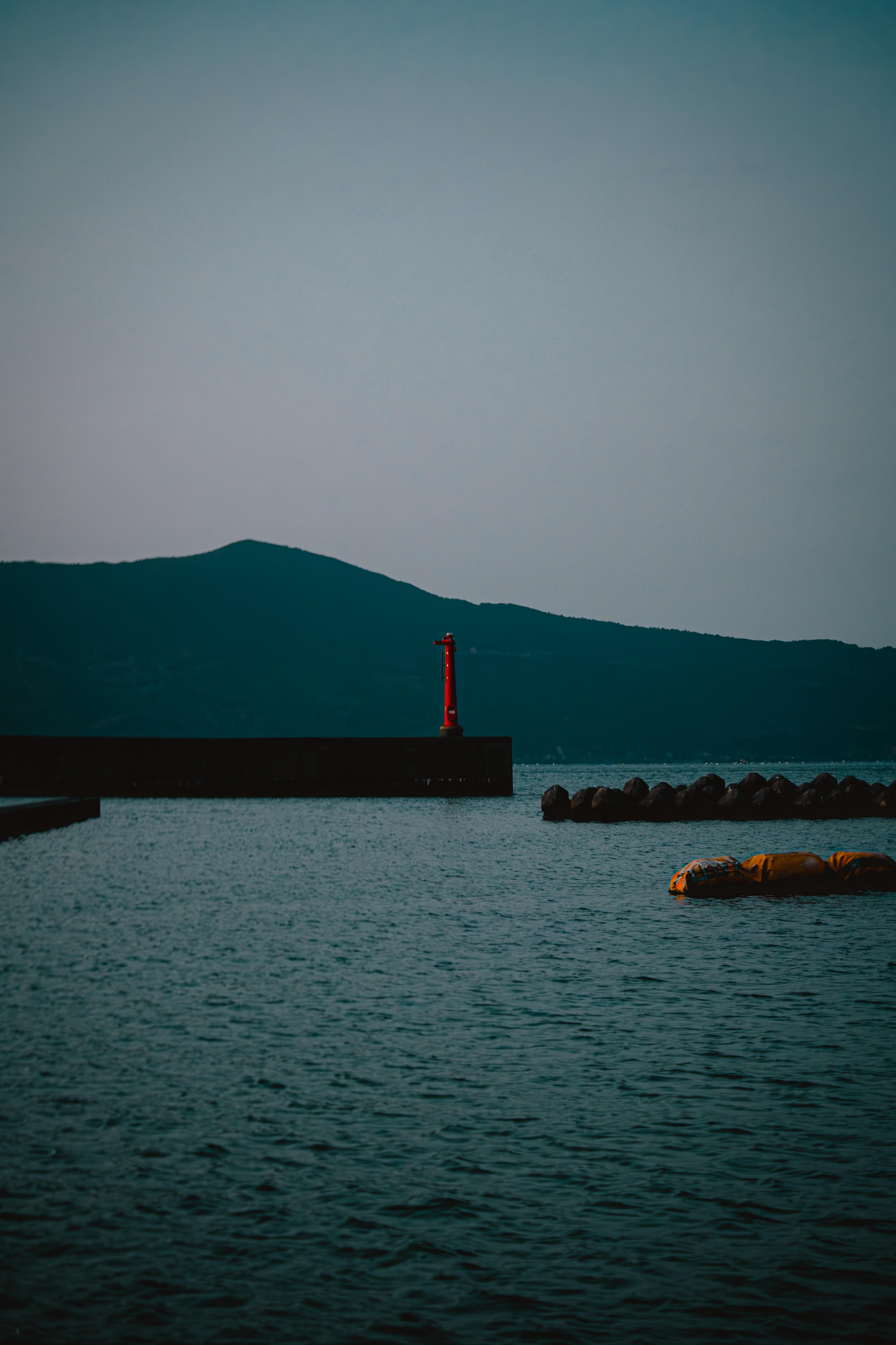 三重県答志島の和具港にある赤い灯台の写真素材です。黒い防波堤の上に立つ赤い灯台は、船舶の安全航行を支える重要な灯標で、緑色の山々を背景に港湾の風景を引き立てています。黄色いブイや護岸ブロックなど港湾施設も見え、漁業や地域の沿岸風景などのコンテンツに最適です。