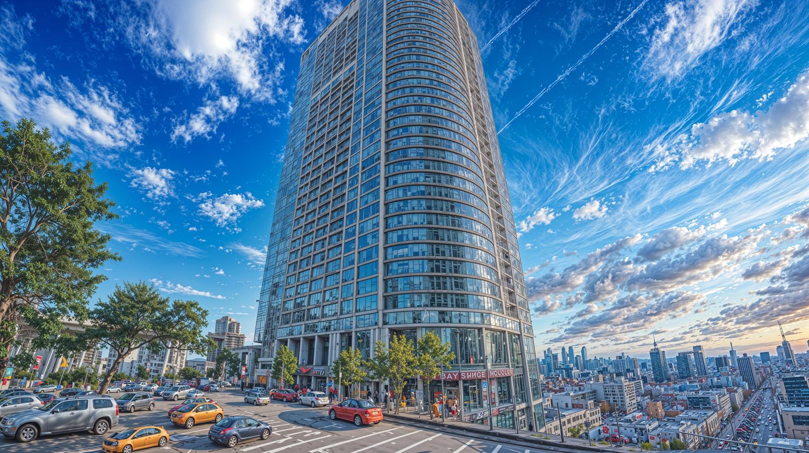 AIで生成した高層マンションと駐車場がある都市風景の画像素材です。曲線を描く高層マンションが晴天の青い空を背景に立ち、手前には駐車場に停車する複数の車が見え、左手には街路樹が配置され、奥には別のビルや建物群が広がっています。都市計画やビジネス関連、建築デザインのイメージ資料におすすめです。