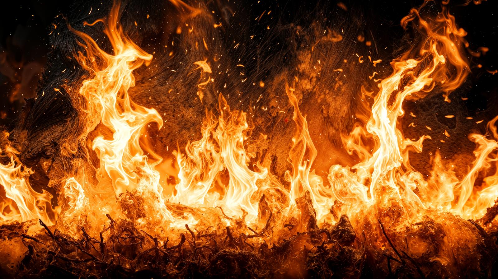 AIで生成した炎が激しく燃え上がる画像素材です。枝や枯草の上から複数の炎が立ち上がり、火の粉が飛び散っている。火災・焚き火・炎エフェクトを使った制作物に使えます。