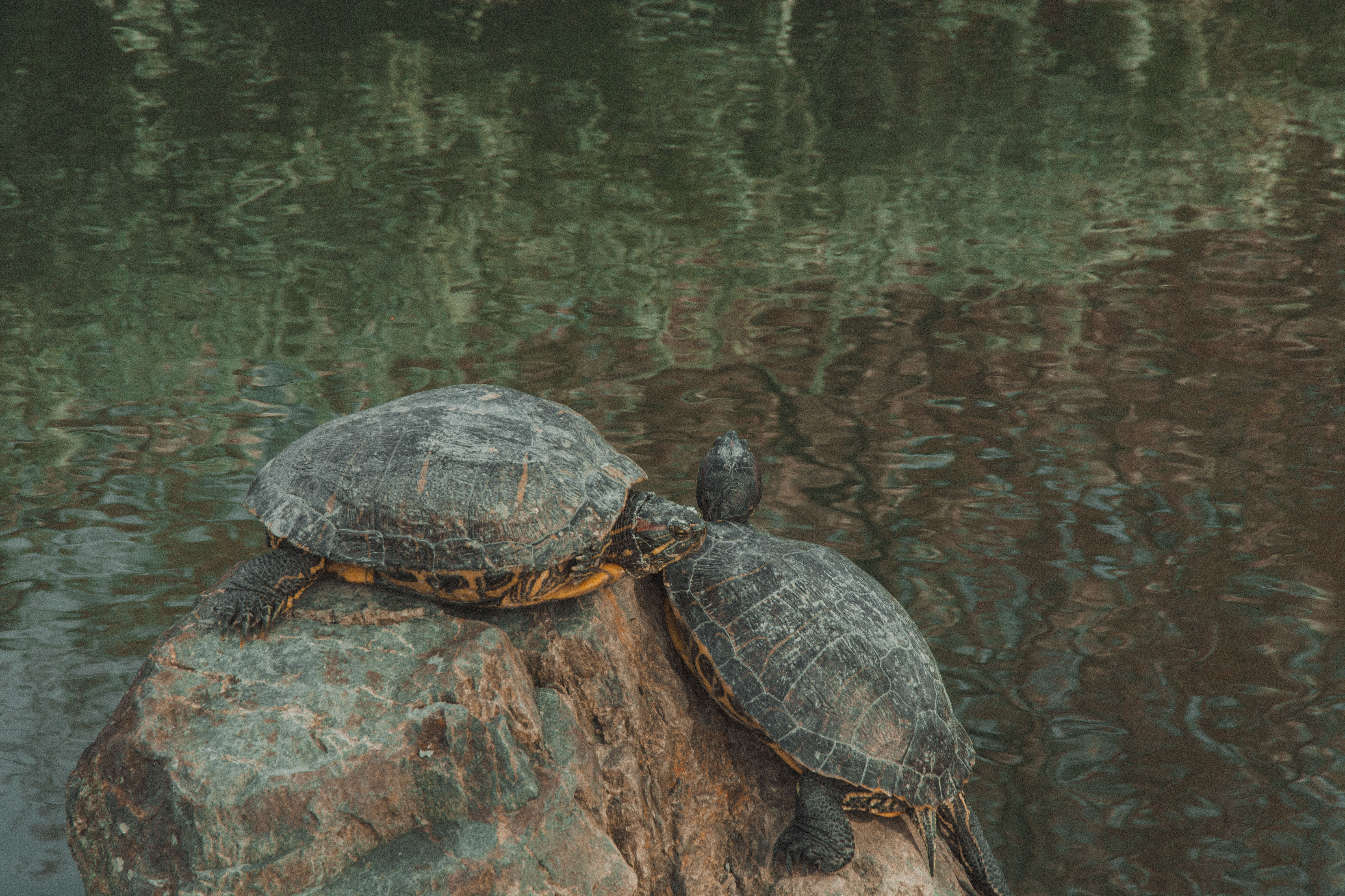 Two turtles resting on a rock by the water