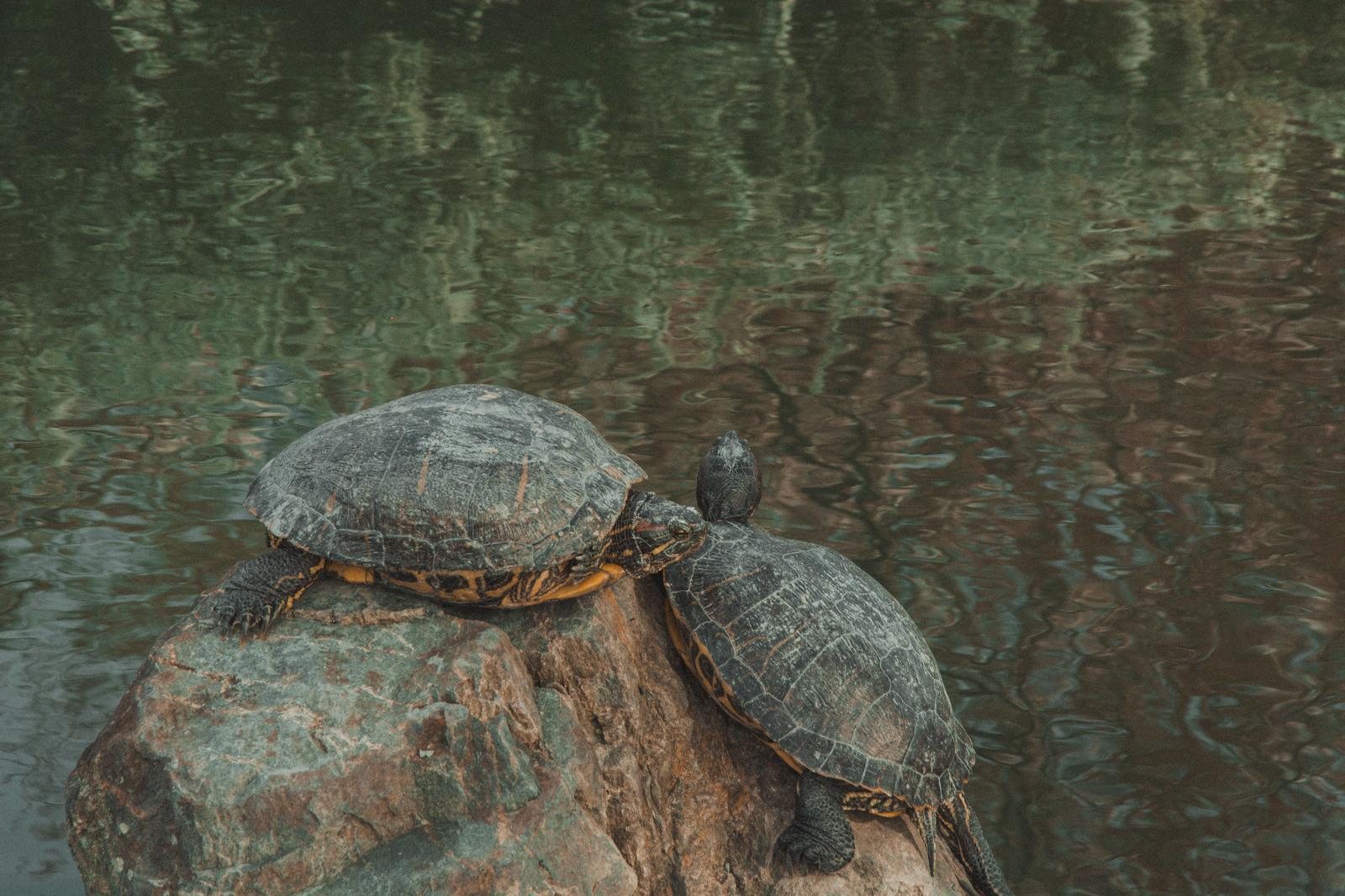 池の岩の上で休む2匹のカメの写真素材です。大小2匹が並び、背中に黄色いラインが走っている。自然・動物をテーマにしたブログやSNS投稿に使えます。