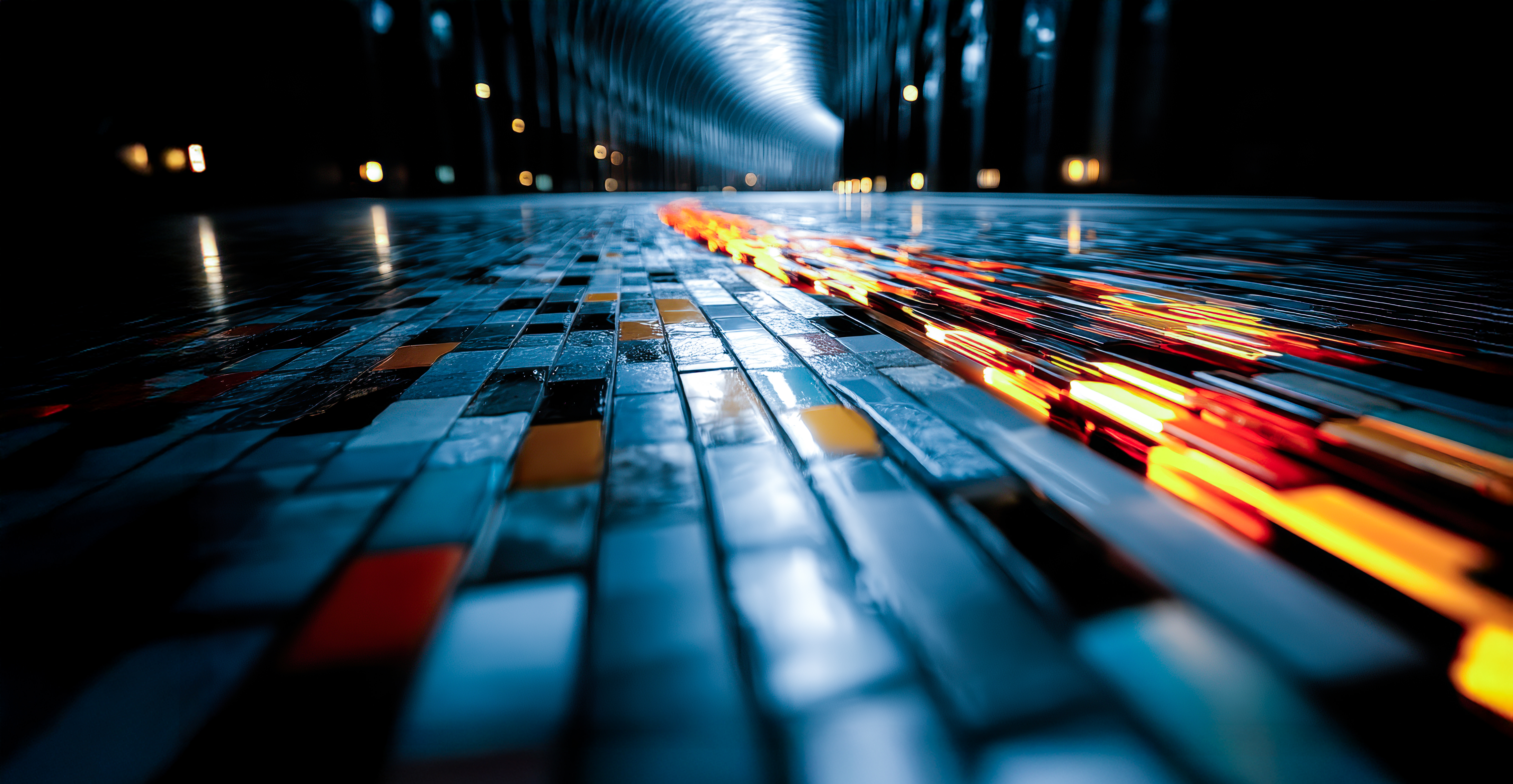 AIで生成した近未来的な歩道の画像素材です。暗い空間の床をオレンジ色のラインが奥へ向かって走り、強い遠近感が出ている。SF・テクノロジー系のデザイン素材に向いています。