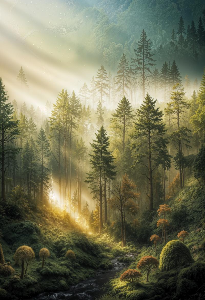苔むした巨木に囲まれた木造小屋と光が差し込む深い森
