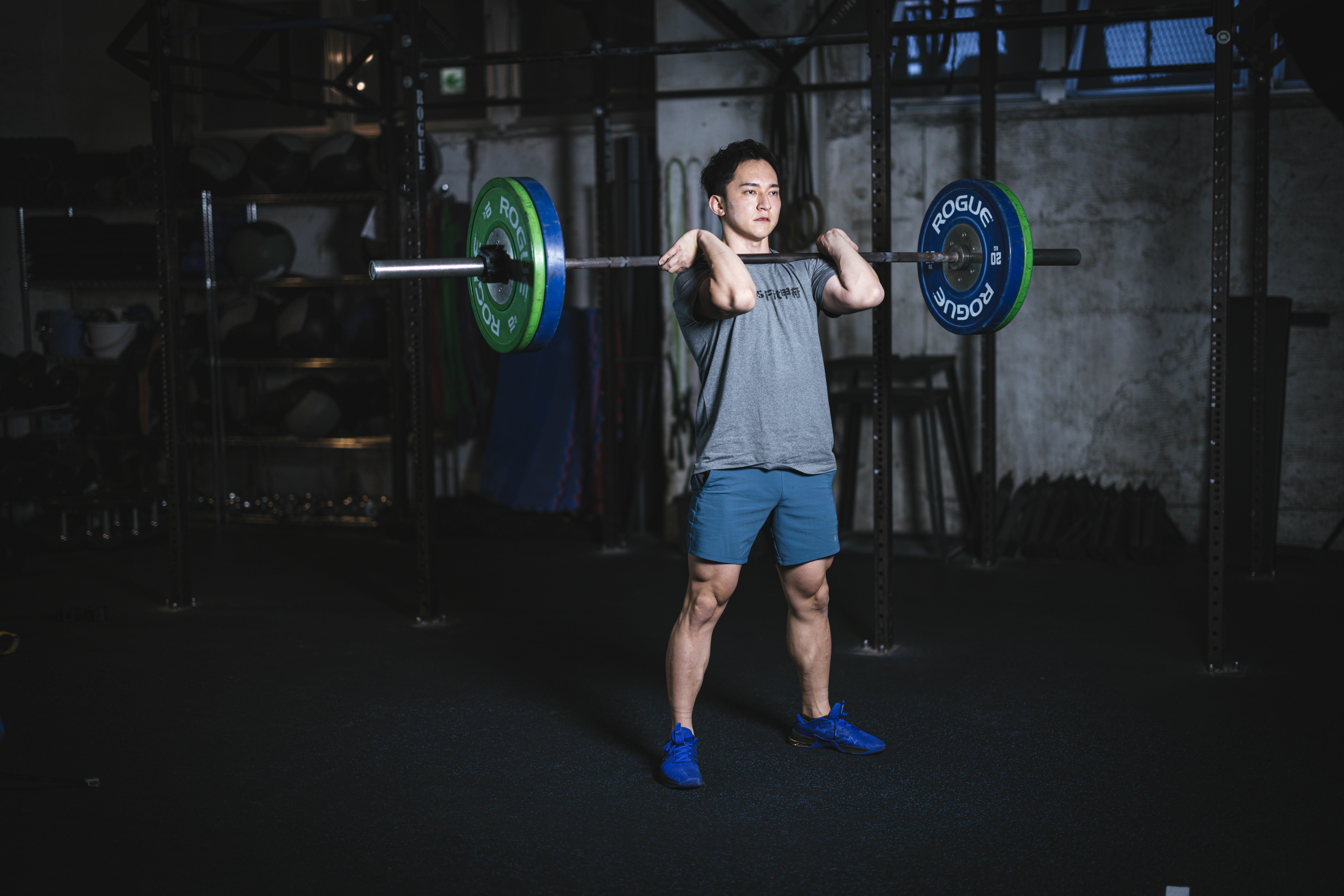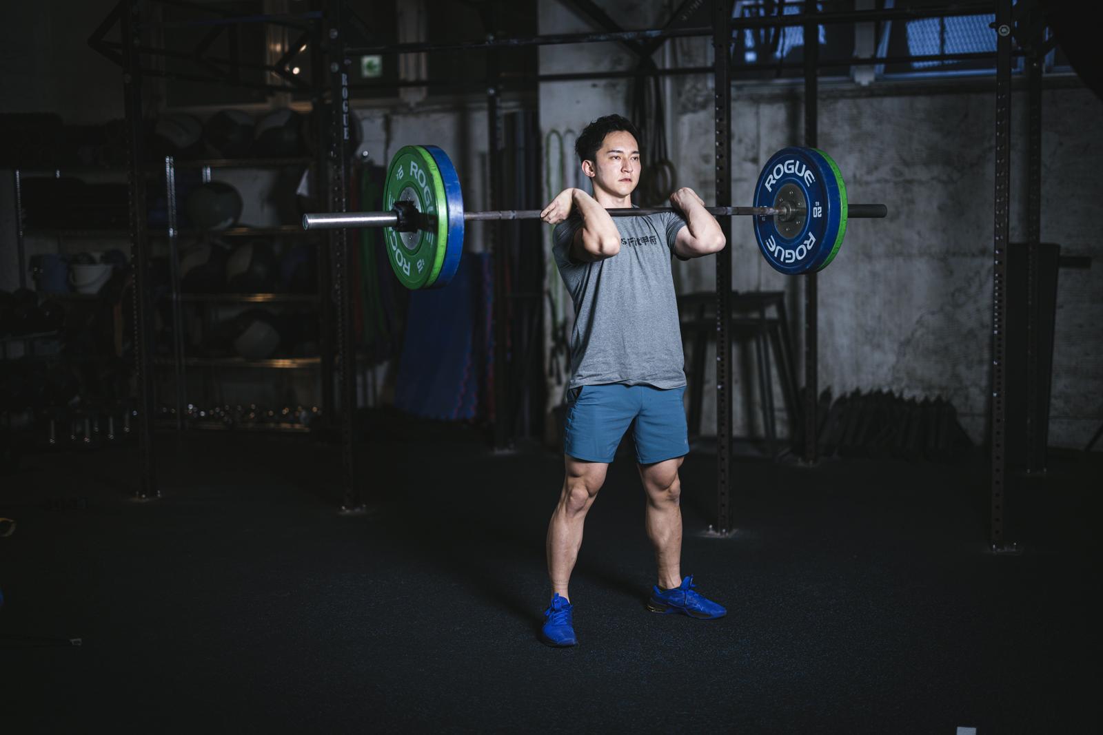 バーベルを担いで体を起こす男性のトレーニング風景の写真素材です。グレーのTシャツと青いショーツを着た男性がカラフルなプレート付きバーベルを肩に乗せ、産業風の広いジム空間で立っています。ジムやフィットネス関連のWebサイト、トレーニング指導のコンテンツ、健康・運動系ブログなどにおすすめです。