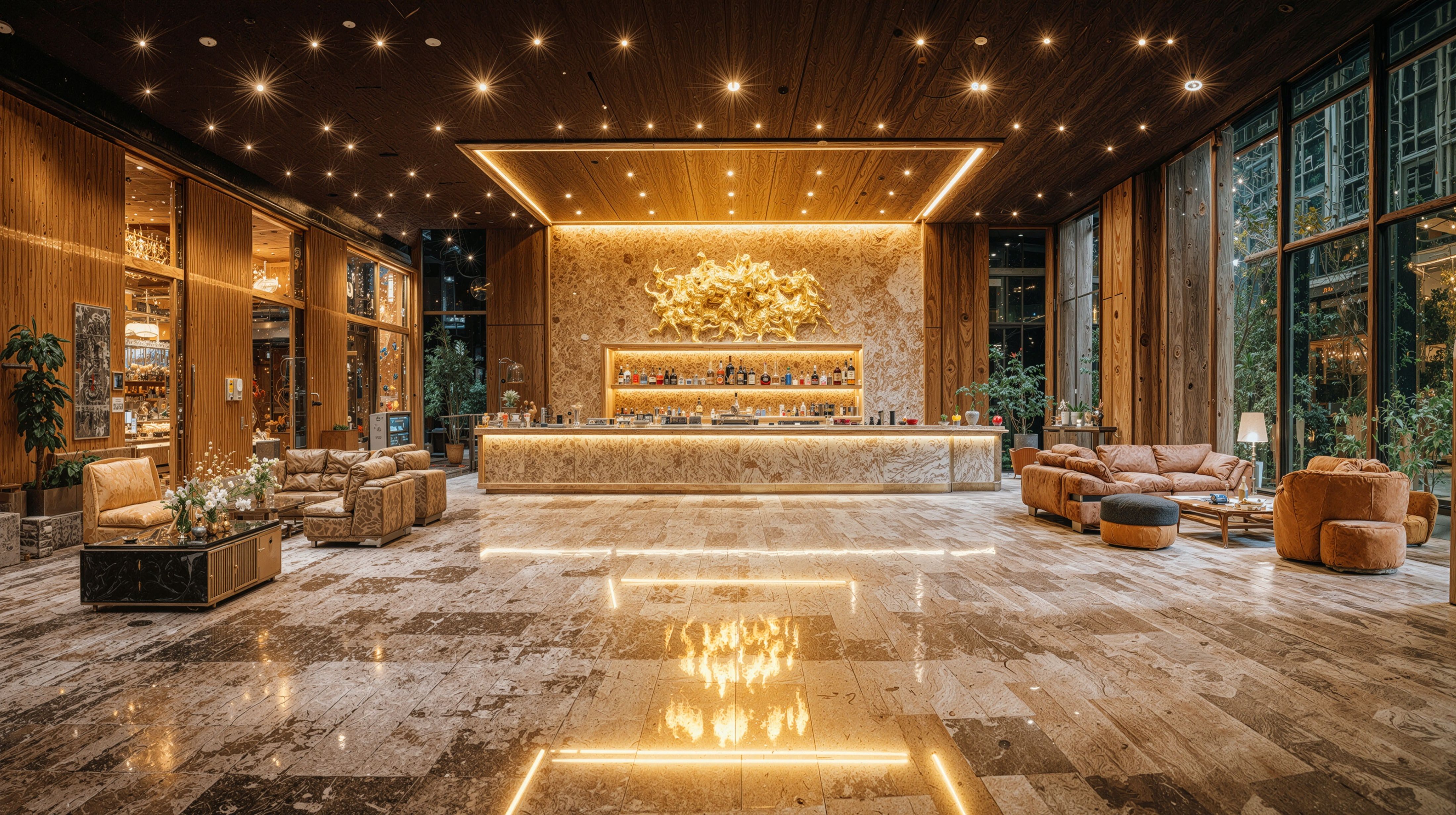 AIで生成した高級ホテルレストランの画像素材です。大きな窓から自然光が差し込む開放的な空間に、木目調の内装と大理石の床が配置されています。間接照明と観葉植物が空間にアクセントを加え、上質な雰囲気を演出しています。ホテルや飲食店の紹介資料、インテリアデザインの参考資料に使えます。
