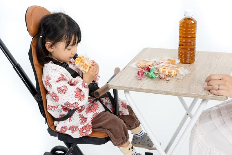 ピンクの羽織を着た母親が、テーブルでおやつを食べる幼児をベビーカーの隣で優しく見守っている。白背景のスタジオ撮影で、温かい家族の時間を表現。育児サイトや子育て誌、ベビー用品広告に最適な一枚です。
