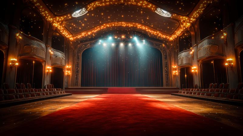 シャンデリアが輝く劇場風の舞台とレッドカーペットが広がる壮麗な空間のAI画像素材(フリー)
