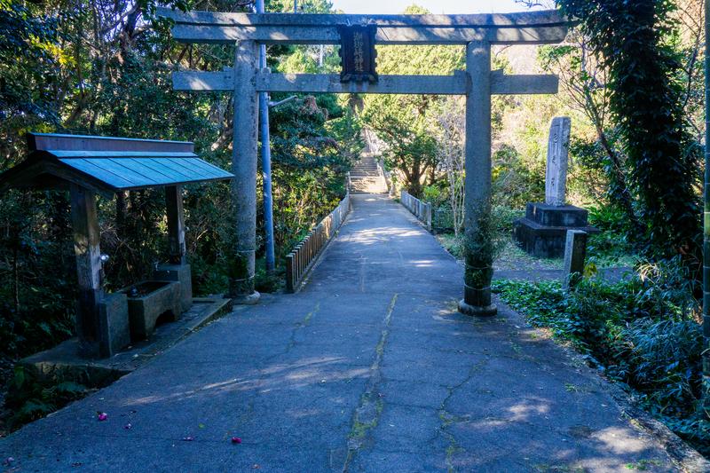 木々に囲まれた神社の参道を正面から撮った写真素材です。石造りの鳥居の奥に石段が続き、左手に手水舎がある。参拝シーンや日本の伝統文化を伝える素材に向いています。