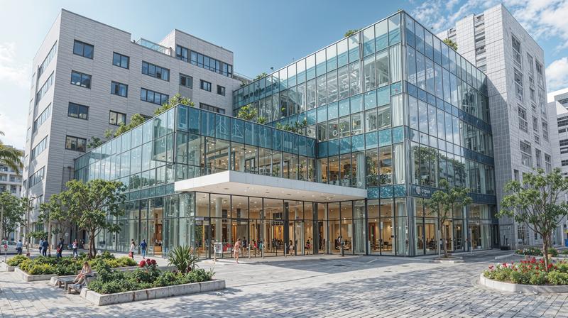 AIで生成したガラス張りの現代的な複合施設の画像素材です。透明感のあるガラス外壁と石材を組み合わせた建物で、広々としたエントランス前には整備された歩道と植栽があります。都市開発、建築デザイン、不動産関連のコンテンツに使えます。