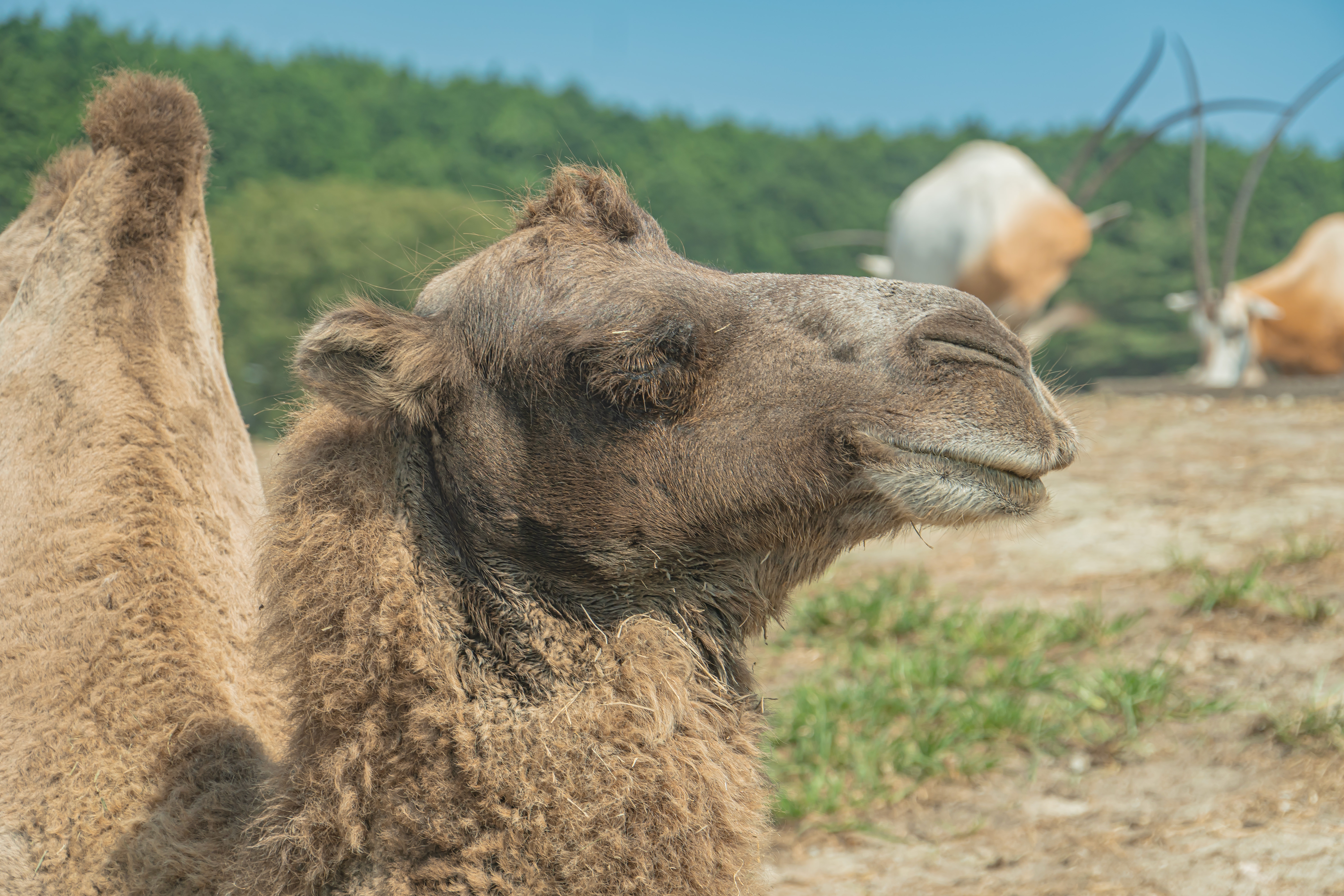 草原でくつろぐラクダの横顔の写真素材です。茶色い毛に覆われた体と穏やかな表情が特徴的で、背景には緑の草木が広がっています。動物園やサファリパークの資料、アニマルセラピーや癒し系コンテンツの挿絵に使えます。