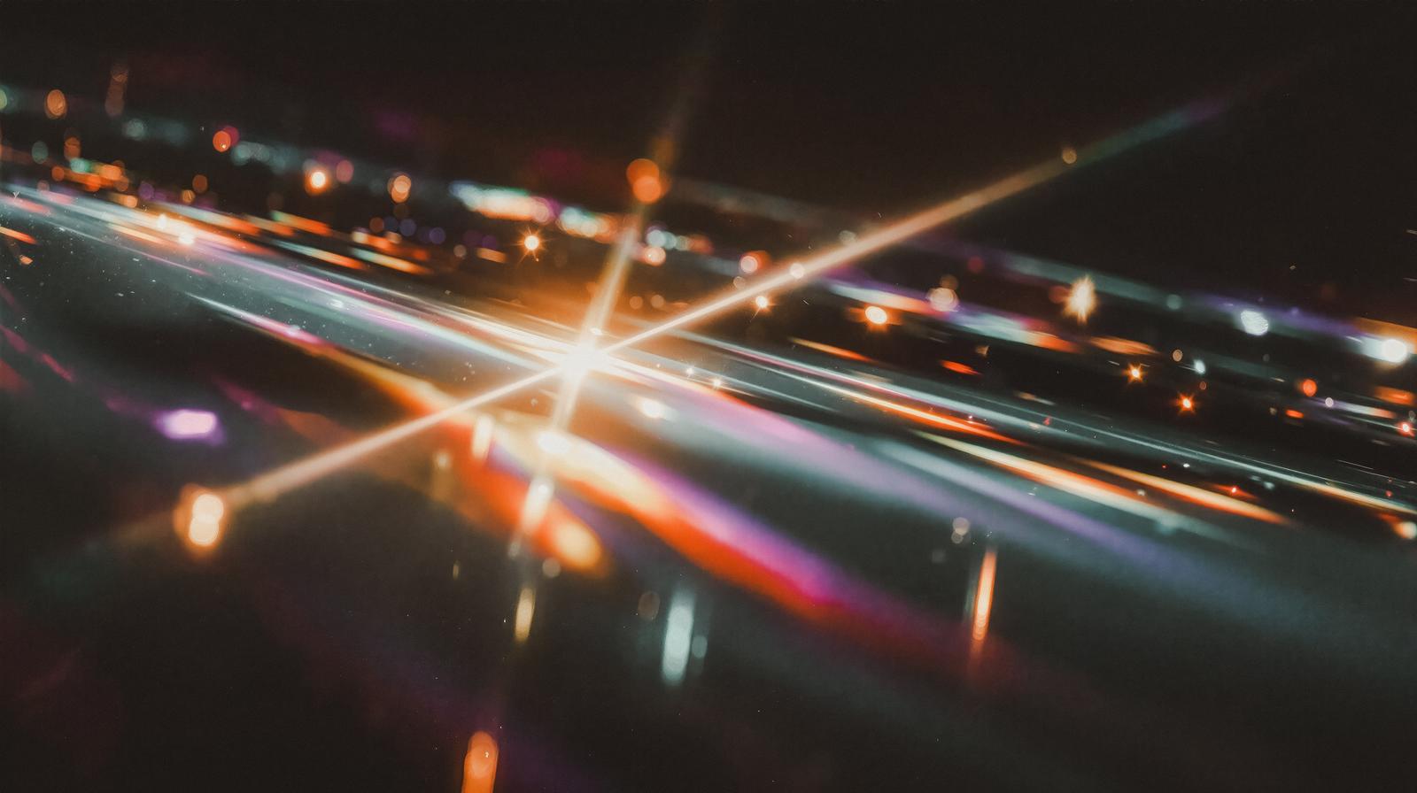 暗い背景に光の束が交差して放射状に伸びるライトトレイル