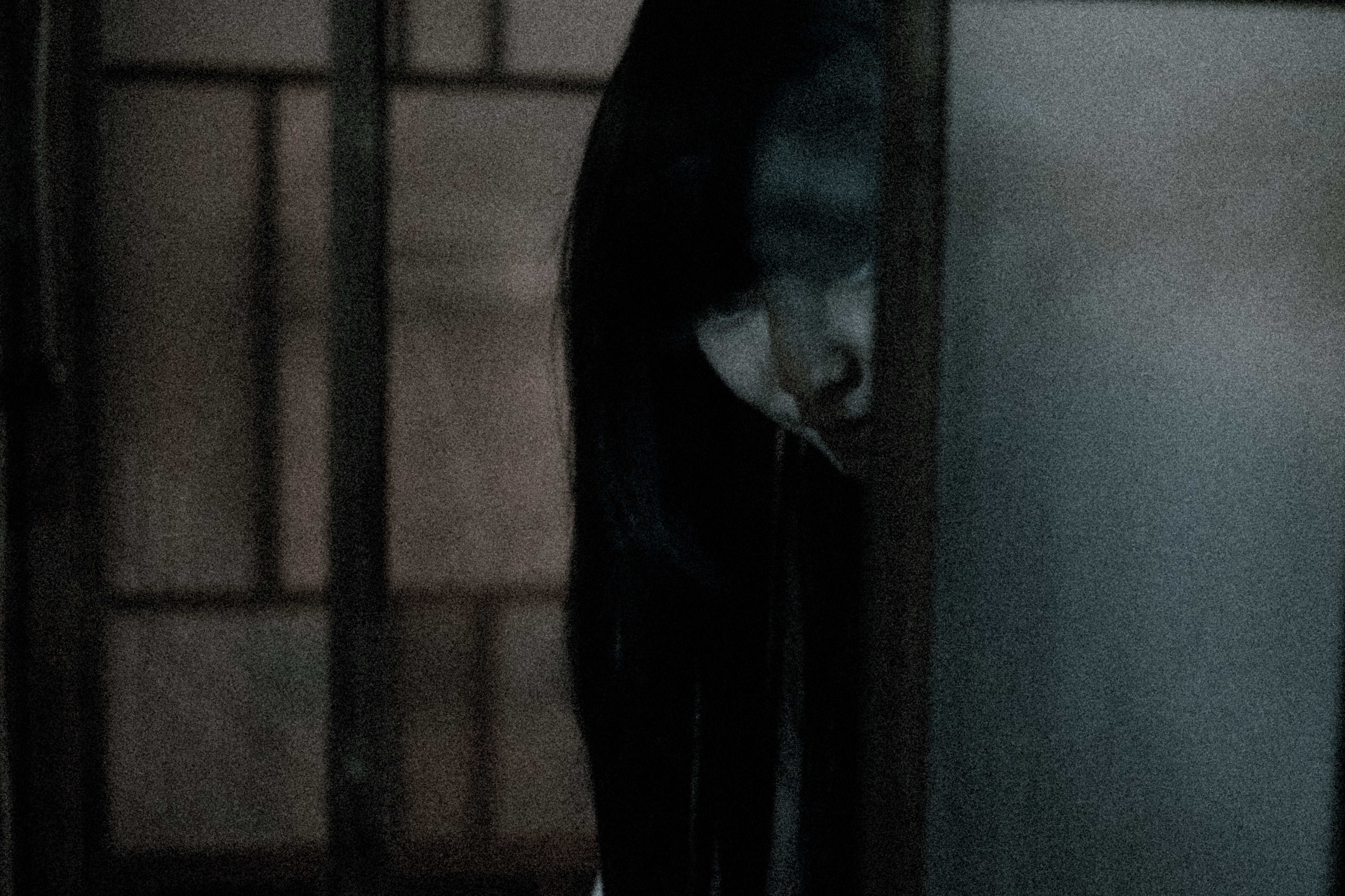 障子から覗く怨霊の顔を写した恐怖系の写真素材です。薄暗い和室で黒い髪に覆われた顔が見えます。日本家屋の静寂とした空間に不気味な存在が映り込んでいます。ホラー映画のポスターやお化け屋敷の宣伝、怖い話の挿絵に使えます。
