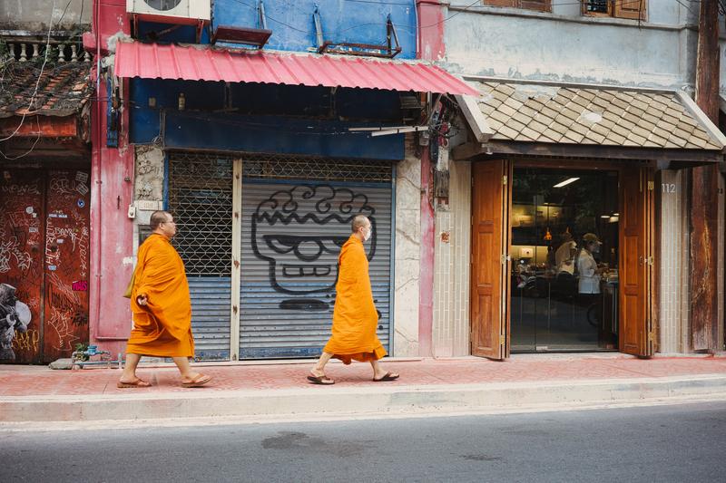 オレンジ色の袈裟をまとい街中を歩く二人の僧侶の写真素材です。古い建物や落書きが施された壁、シャッターの閉まった店舗が並ぶ市街地の歩道を僧侶が歩いています。宗教的な題材やアジア文化、街角スナップの素材に使えます。