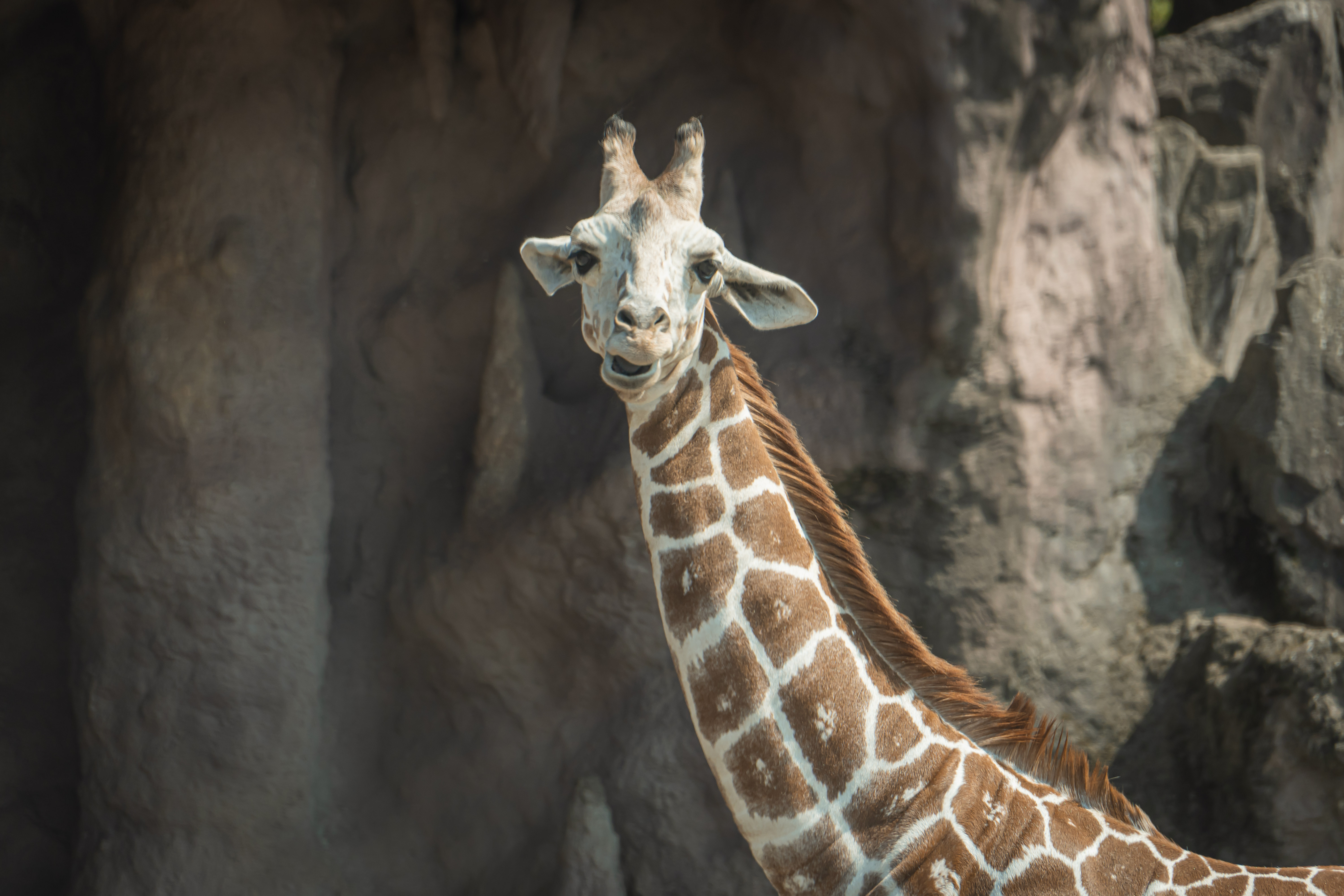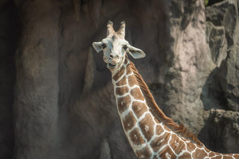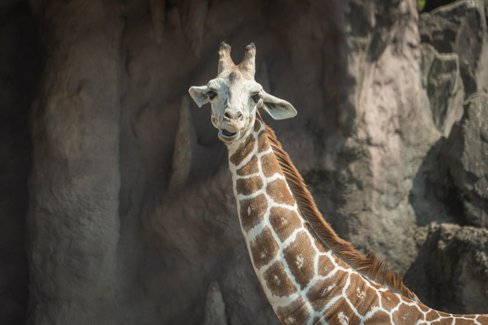 キリンが振り返る様子の写真素材です。茶色と白の網目模様が特徴的な首の長い草食動物が、岩場を背景にこちらを見つめています。大喜利ネタやSNS投稿、動物関連のコンテンツに使えます。