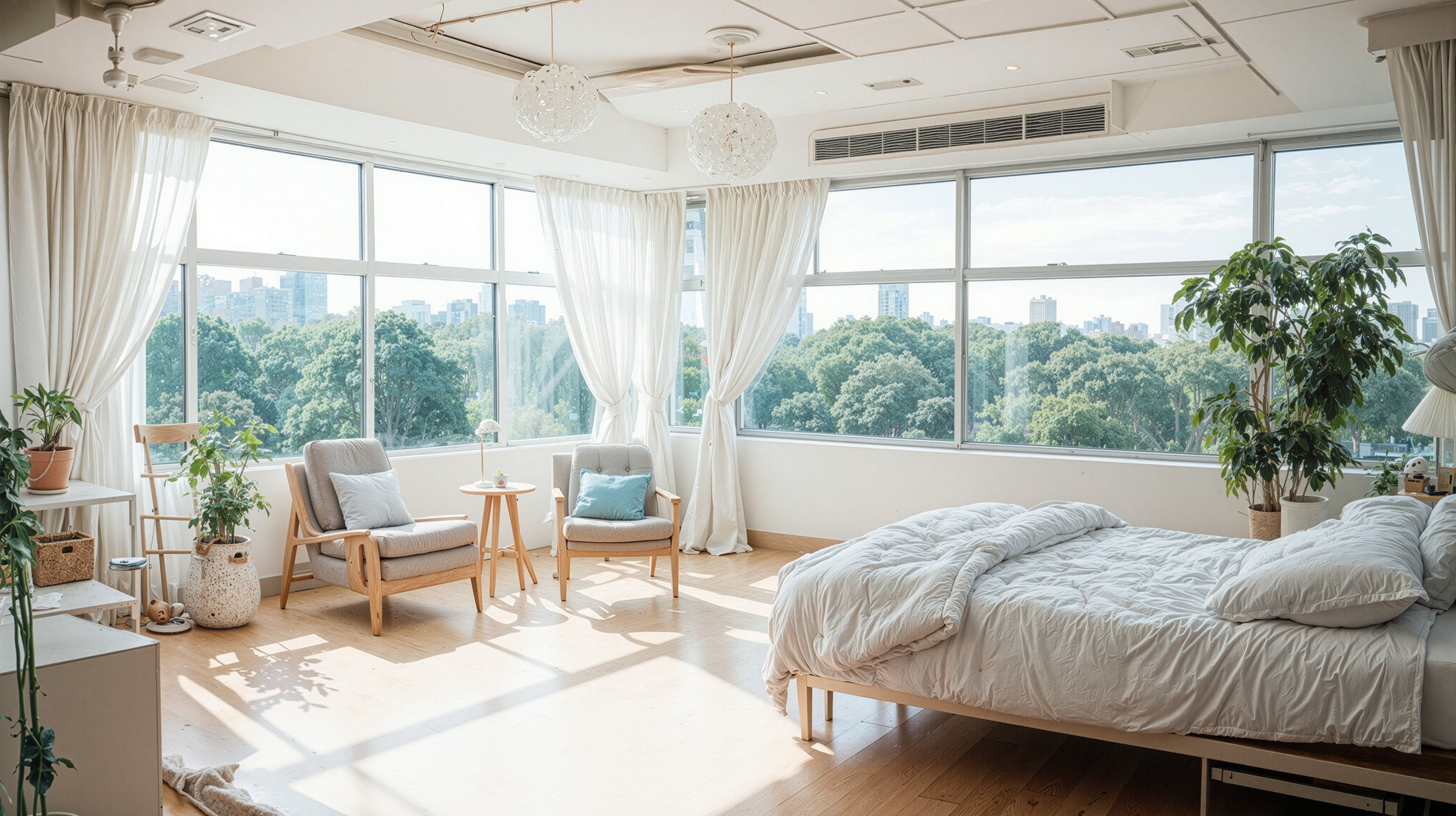 AIで生成した明るい病室の画像素材です。大きな窓から自然光が差し込み、白いカーテンが風に揺れています。木製家具と観葉植物が配置され、療養環境として快適な空間を演出しています。医療関連のウェブサイトや入院生活の紹介コンテンツに使えます。