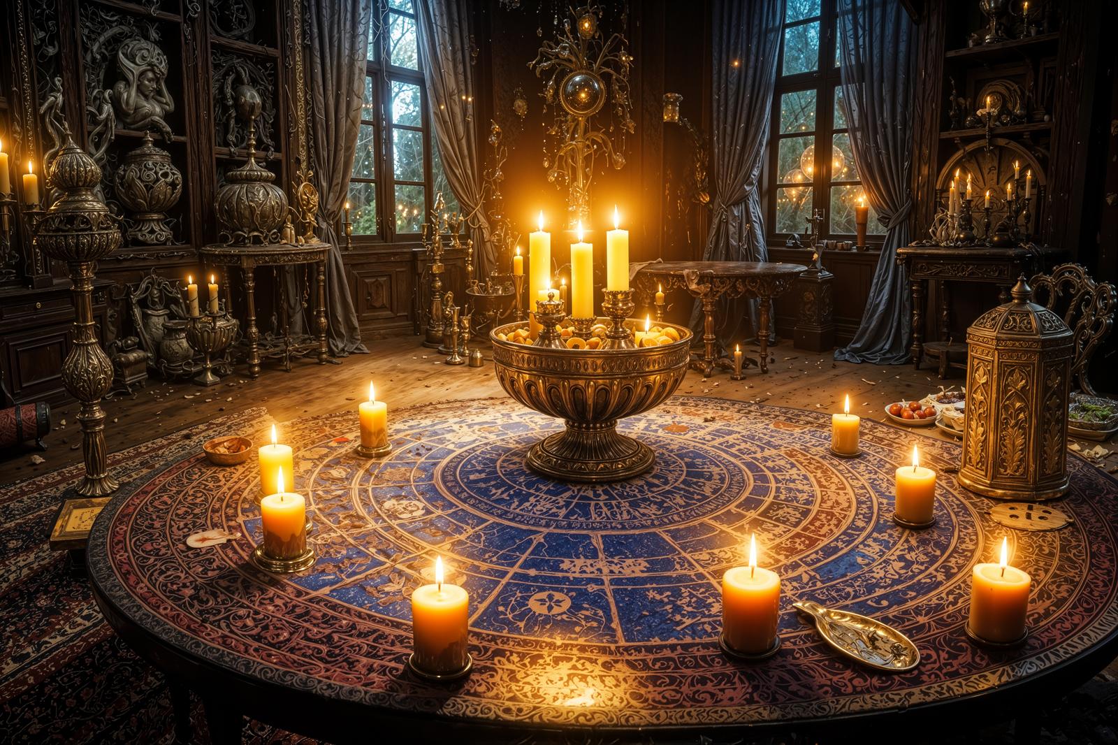 AIで生成した魔法使いの書斎風空間の画像素材です。円形の魔法陣が描かれた床に金色の燭台とキャンドルが配置されています。暗い室内には重厚な家具や装飾品が並び、窓からは薄明かりが差し込んでいます。ファンタジー作品やゲームの背景、オカルト系コンテンツの装飾に使えます。