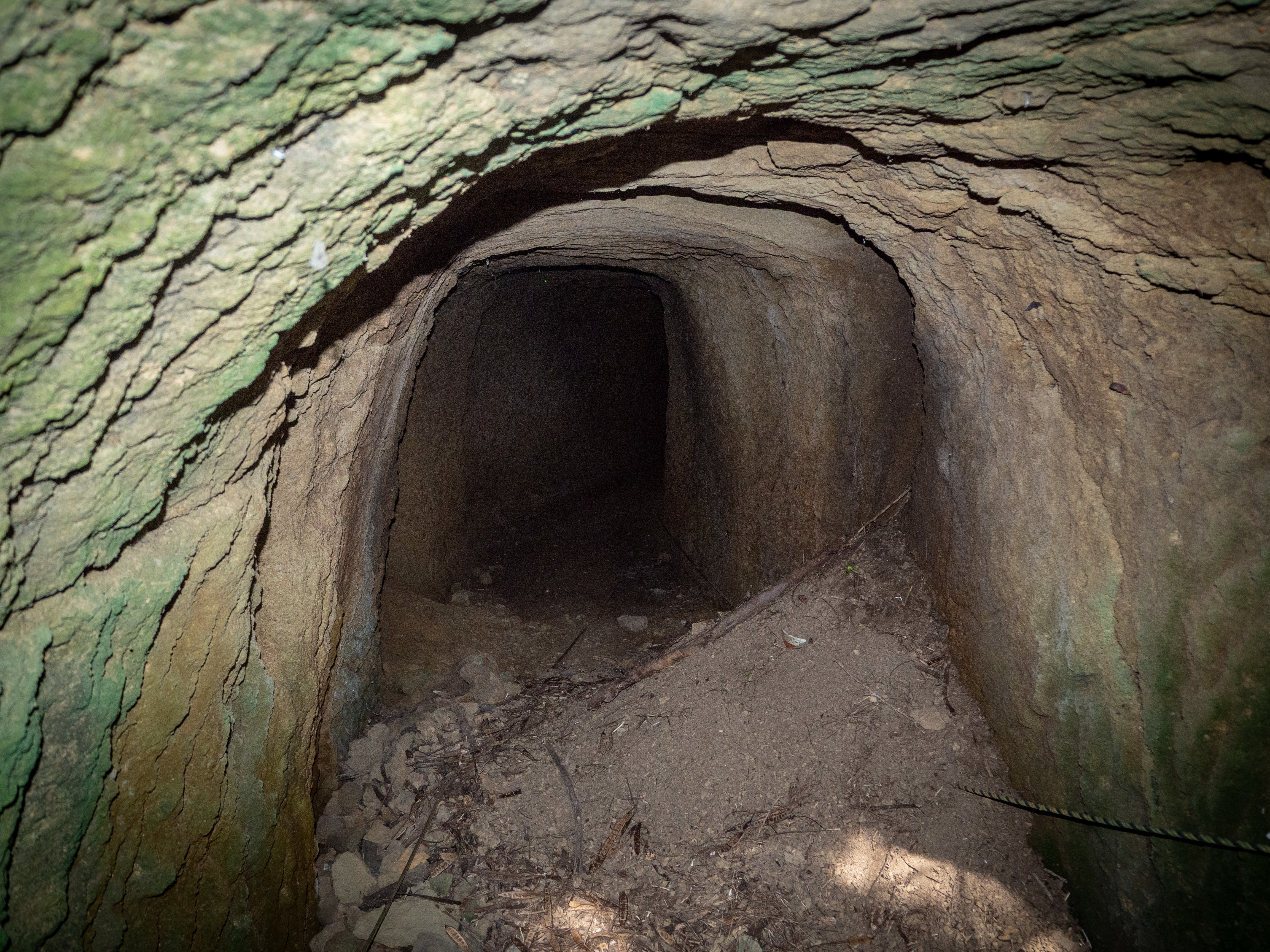 硫黄島第1中隊壕の内部通路を撮影した写真素材です。石積みの壁面には湿気による緑色のカビや苔が生え、奥に向かって暗闇が続いています。床面には砂や小石が堆積し、低いアーチ型の天井が印象的。戦時中の過酷な状況を物語る貴重な歴史的記録として、戦争研究や展示に適しています。