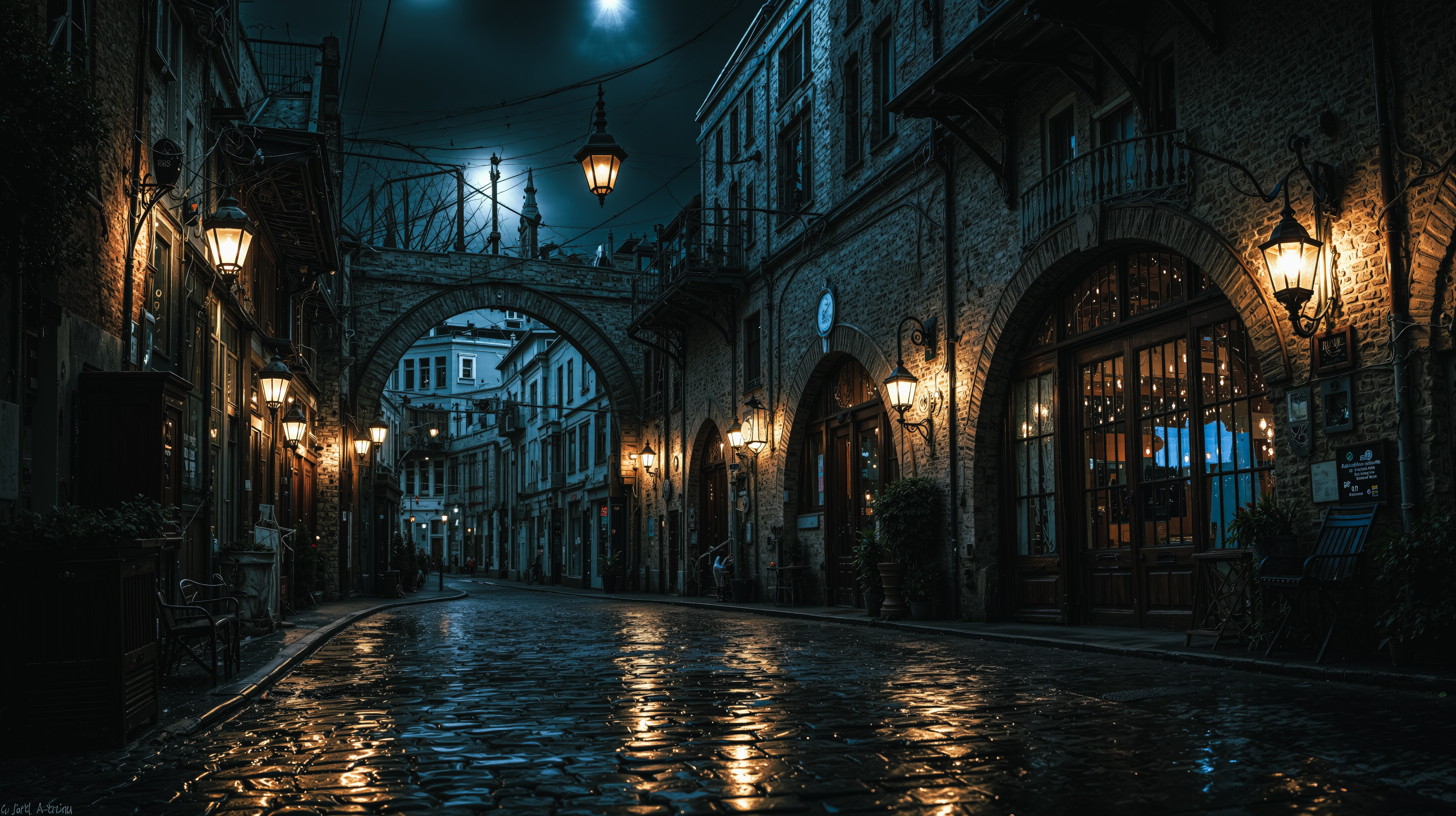 石畳と街灯が照らす夜の旧市街アーチ通りのAI画像素材(フリー)
