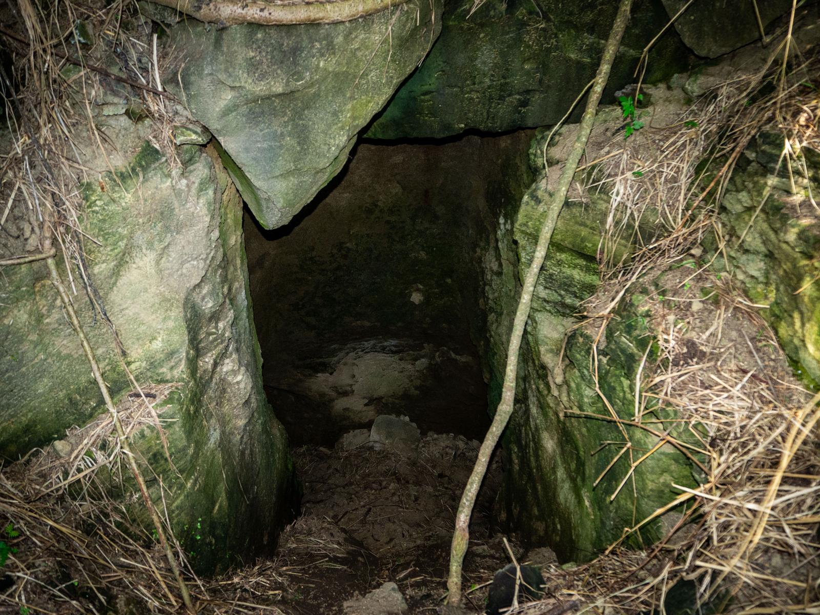 硫黄島の第1中隊の壕東側入口付近の内部を撮影した写真素材です。苔で覆われた石壁が組まれ、枯れ草や植物が入口周辺に点在しています。戦時中の防空壕や地下施設の痕跡が確認できます。戦争遺跡の資料や歴史教材、ドキュメンタリー制作に使えます。