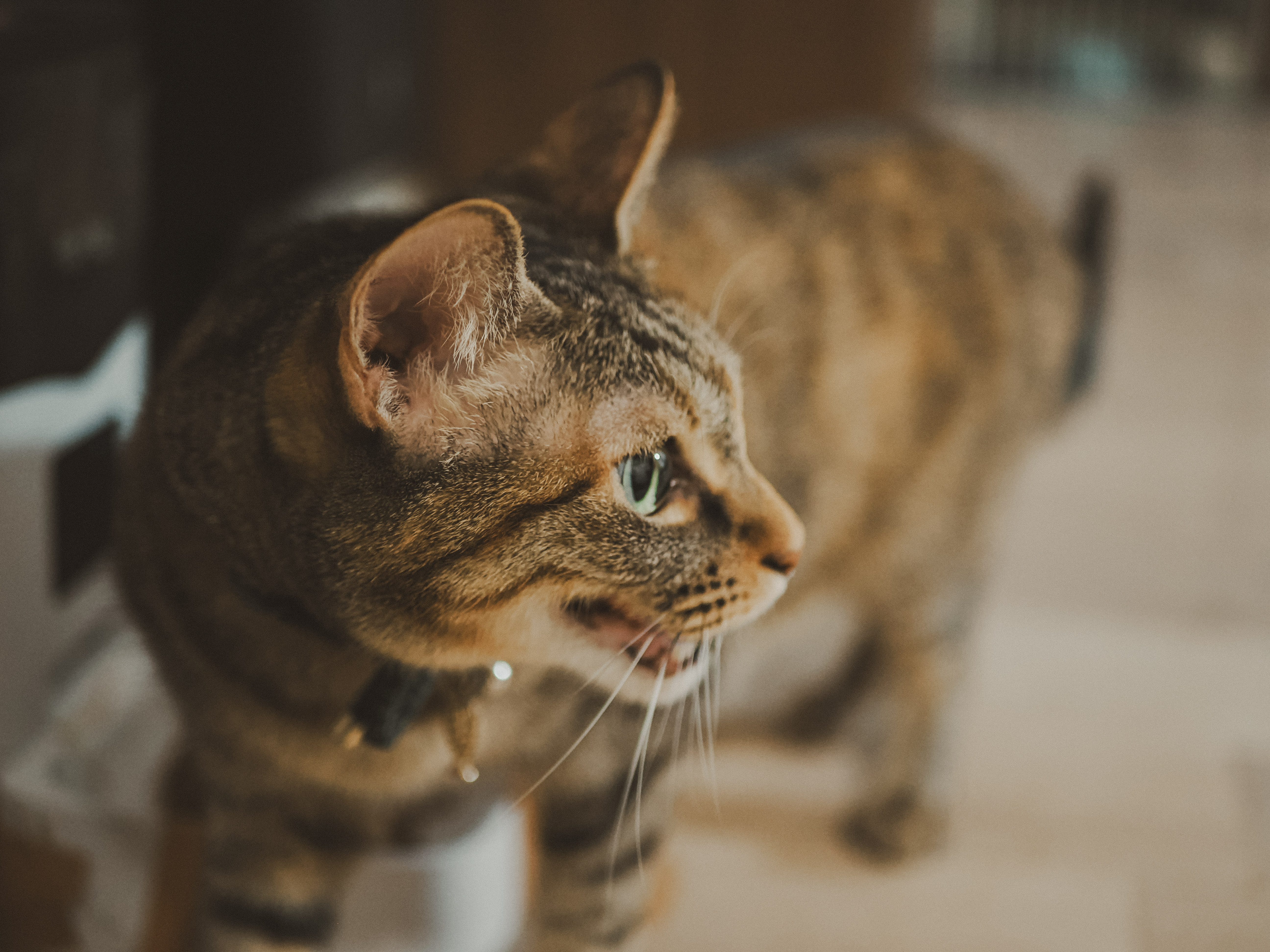 室内で横を向いている茶トラ猫の写真素材です。茶色の毛色と縞模様が特徴的で、首輪を着けています。ペット関連のコンテンツや動物系のブログ記事、SNS投稿に使えます。