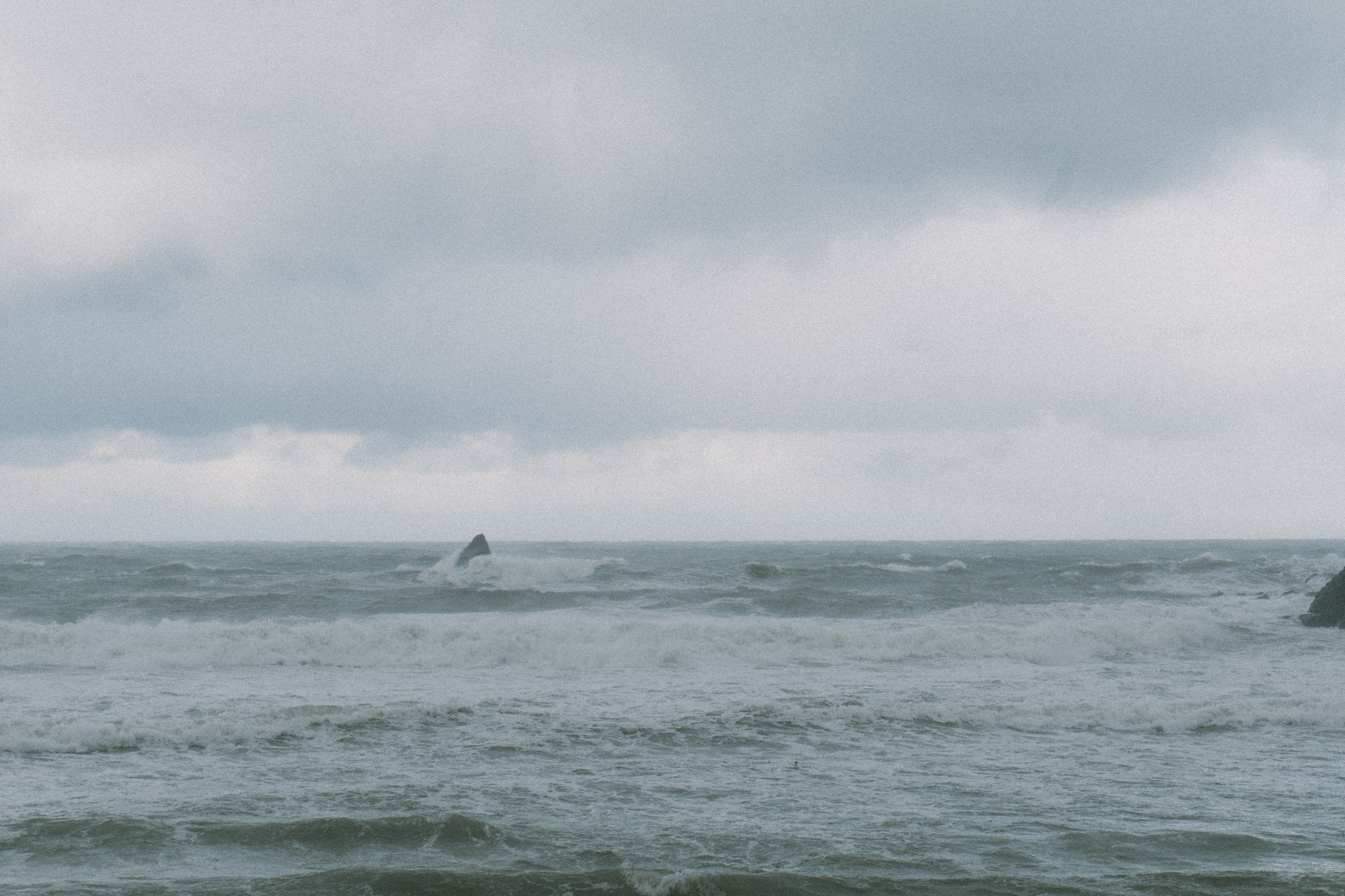 荒れた日本海で高波に包まれる岩礁の写真素材です。灰色の雲が立ち込める曇り空の下、白く泡立つ波が岩に激しく打ち付けています。波しぶきが高く舞い上がり、海面は荒れて白波が立っています。天候や自然の力強さを表現する資料や冬の日本海の記録などに使えます。