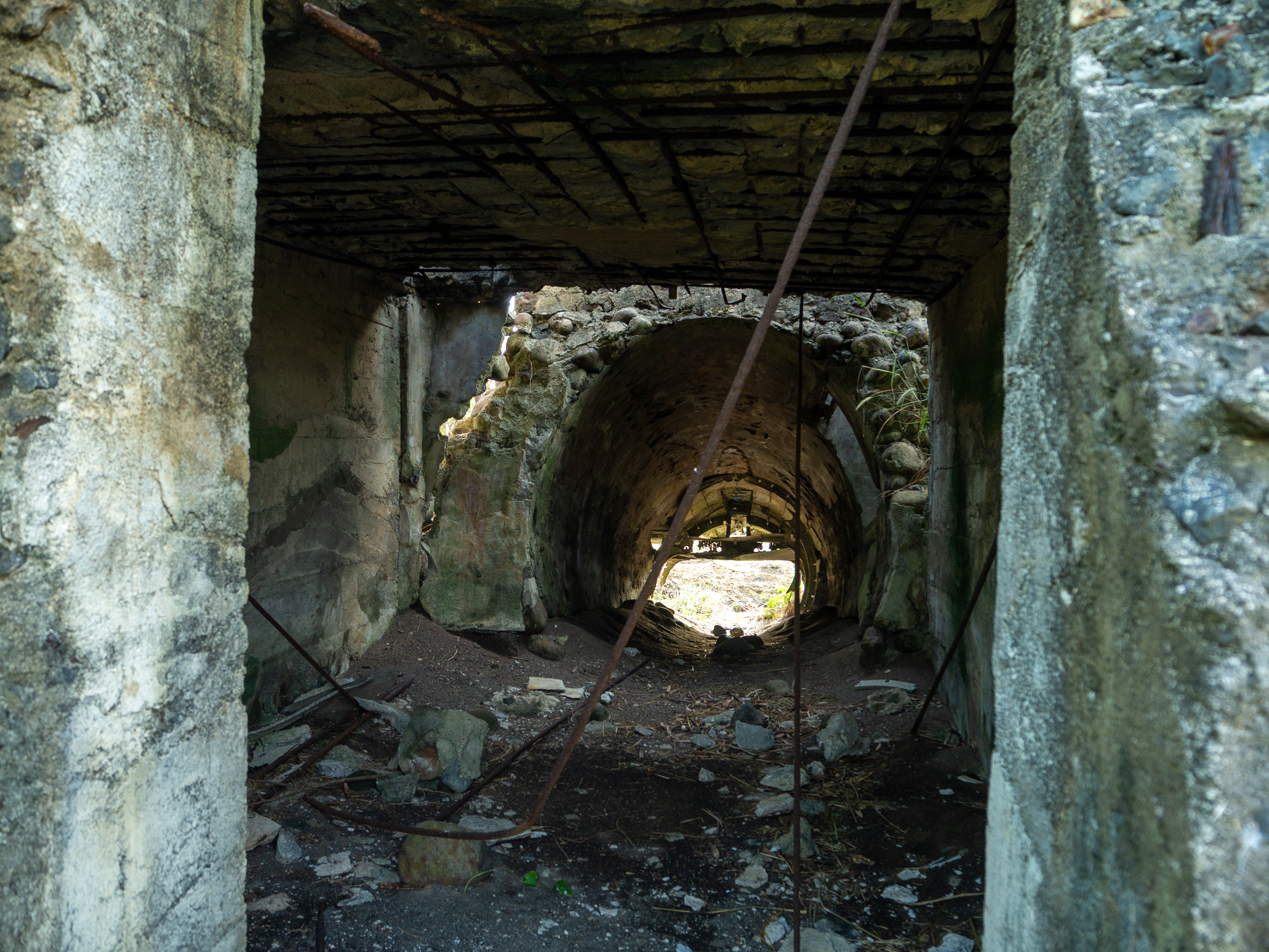 硫黄島トーチカの内部通路の写真素材です。コンクリート製の天井と石積みの壁が続く地下通路で、床には瓦礫や破片が散らばっています。奥に向かって円形の出入り口が見え、自然光が差し込んでいます。太平洋戦争の歴史資料や戦争遺跡の紹介、平和学習の教材などに使えます。