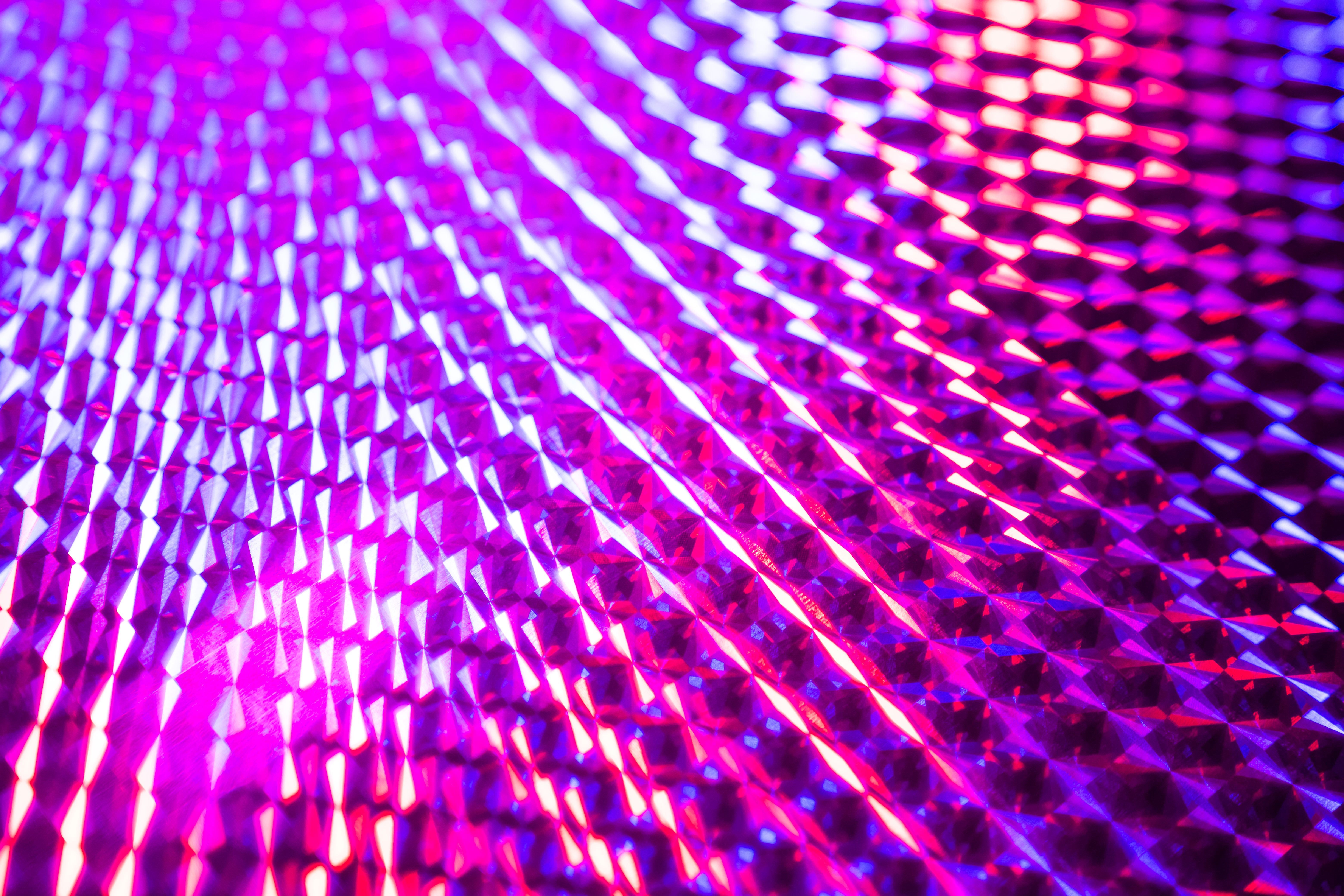 ピンク紫のホログラム調幾何学模様が立体的に輝く写真素材です。プリズム効果により多層的に反射する光が、規則的な菱形パターンを形成しており、ネオンカラーで発光します。デジタルデザイン、テクノロジー関連のサムネイルやバナー制作などにおすすめです。