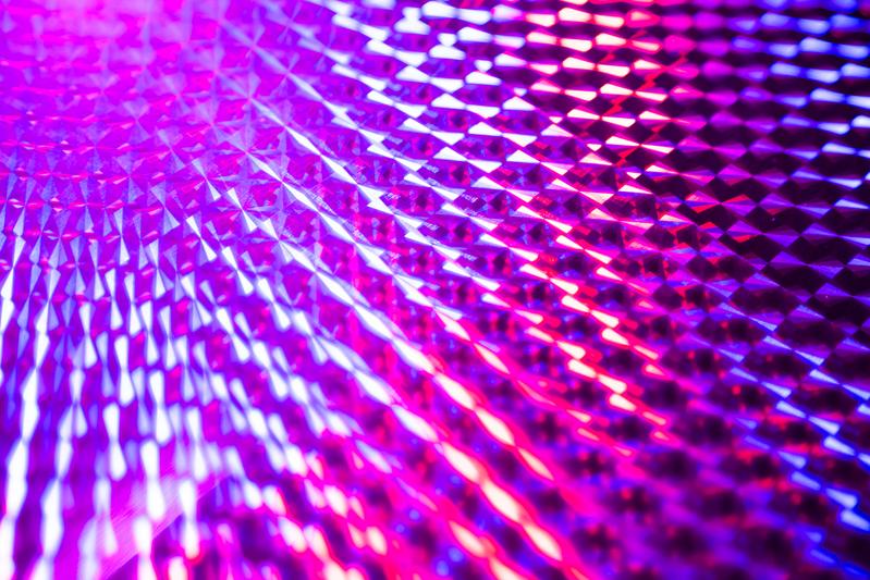 紫とピンク、青が混在するホログラフィック素材の写真素材です。多数の小さなダイヤモンド型パネルが規則正しく配列され、内部から発光して煌めく奥行きのある立体表現を生み出しています。デジタルやエンタメコンテンツ制作などにおすすめです。