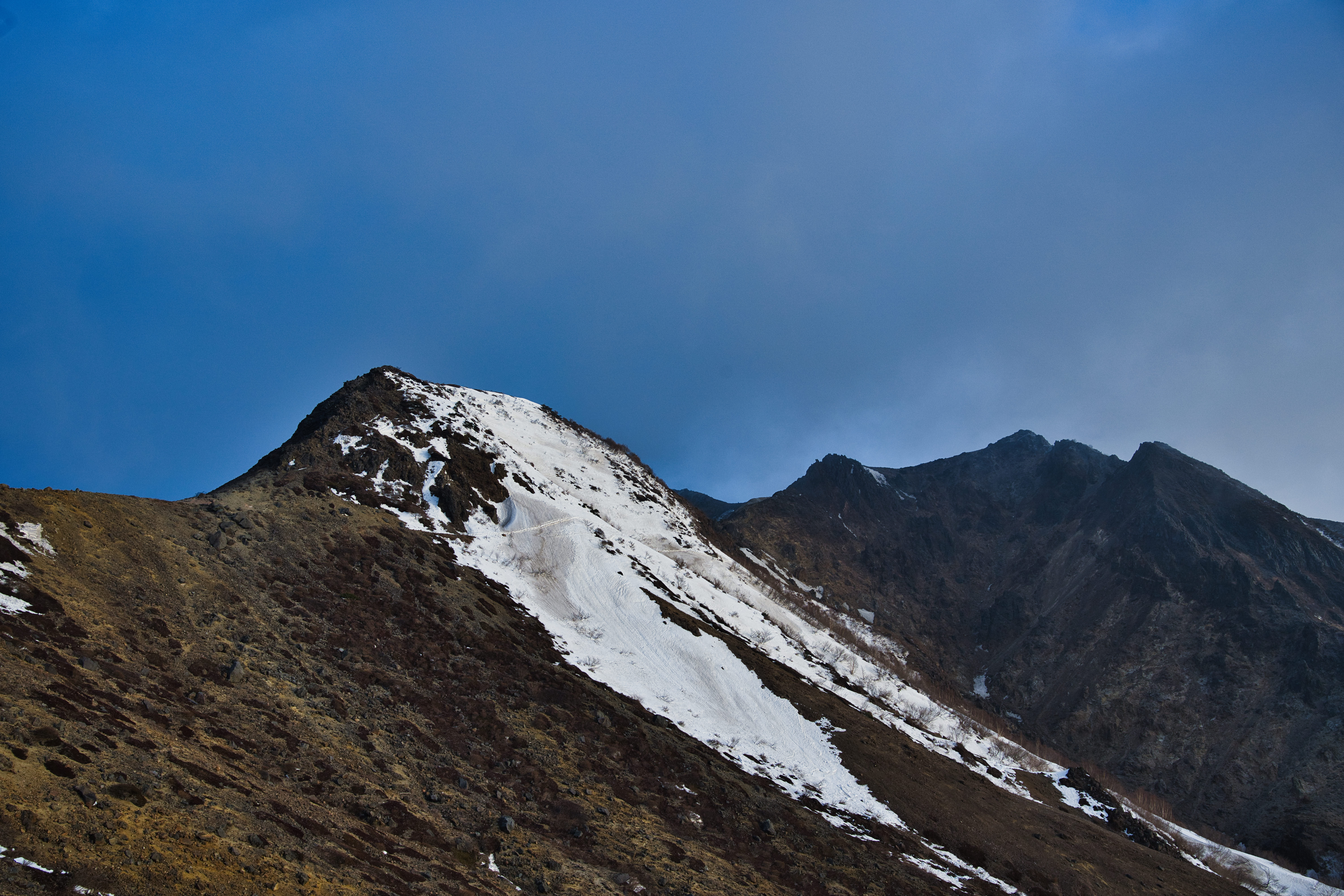 残雪が残る山の稜線を見下ろす写真素材です。雪解けが進み、岩肌と雪が斑模様になっています。登山ブログや春山シーズンの紹介記事などにおすすめです。