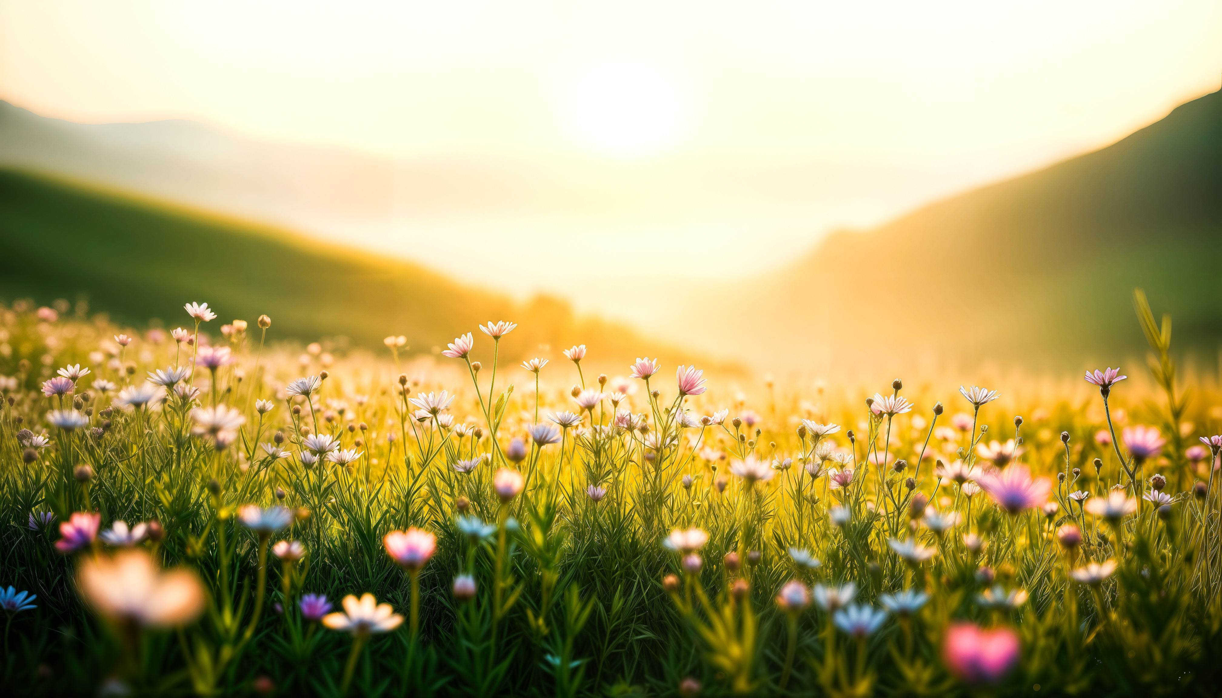 AIで生成した逆光に照らされる花畑の画像素材です。手前の小花がやわらかな光に包まれ、奥には山並みが広がります。自然をテーマにしたデザインや癒しのコンテンツなどにおすすめです。