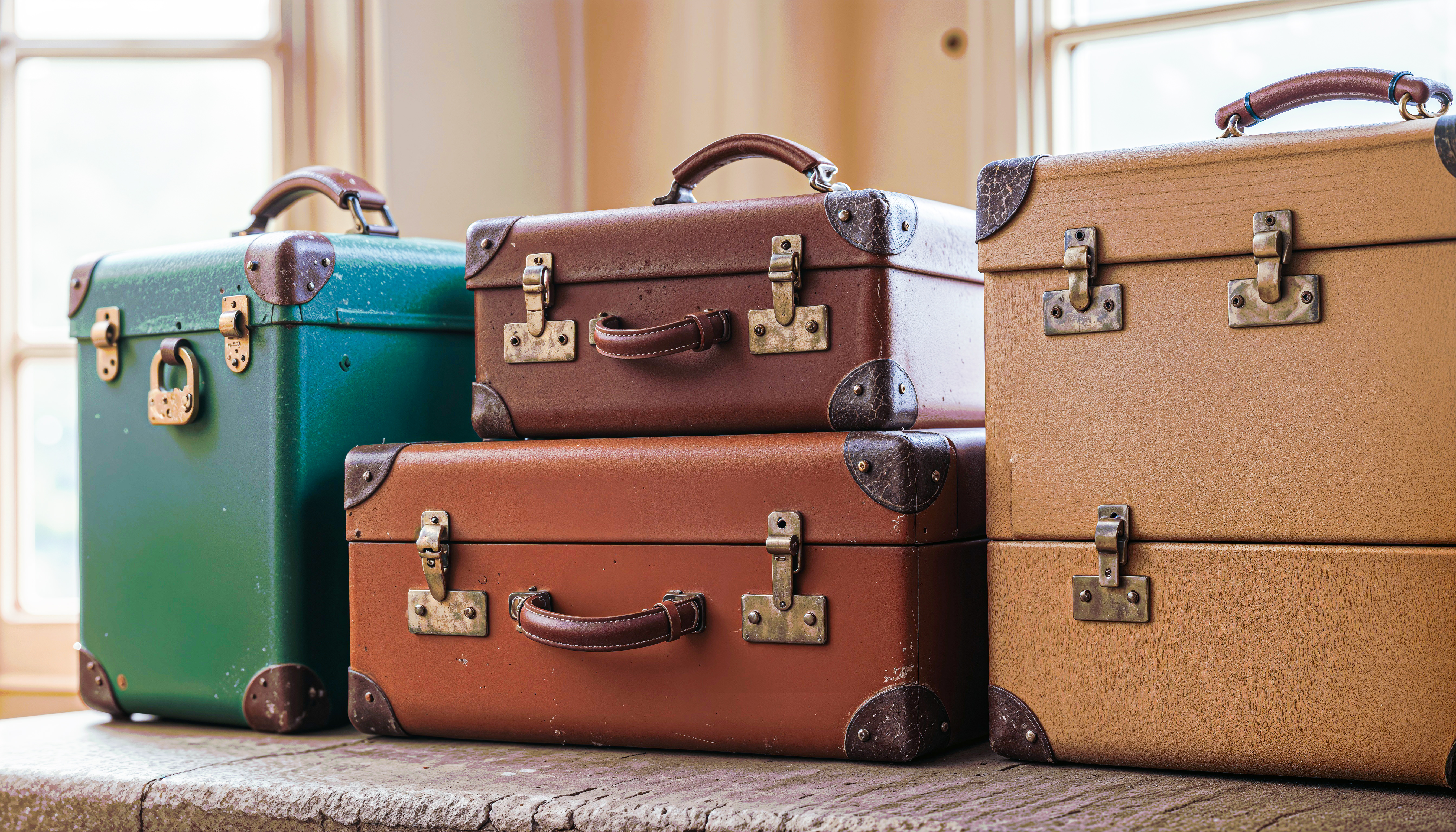 窓辺に重ねて置かれた緑と茶色のアンティークなトランクケース