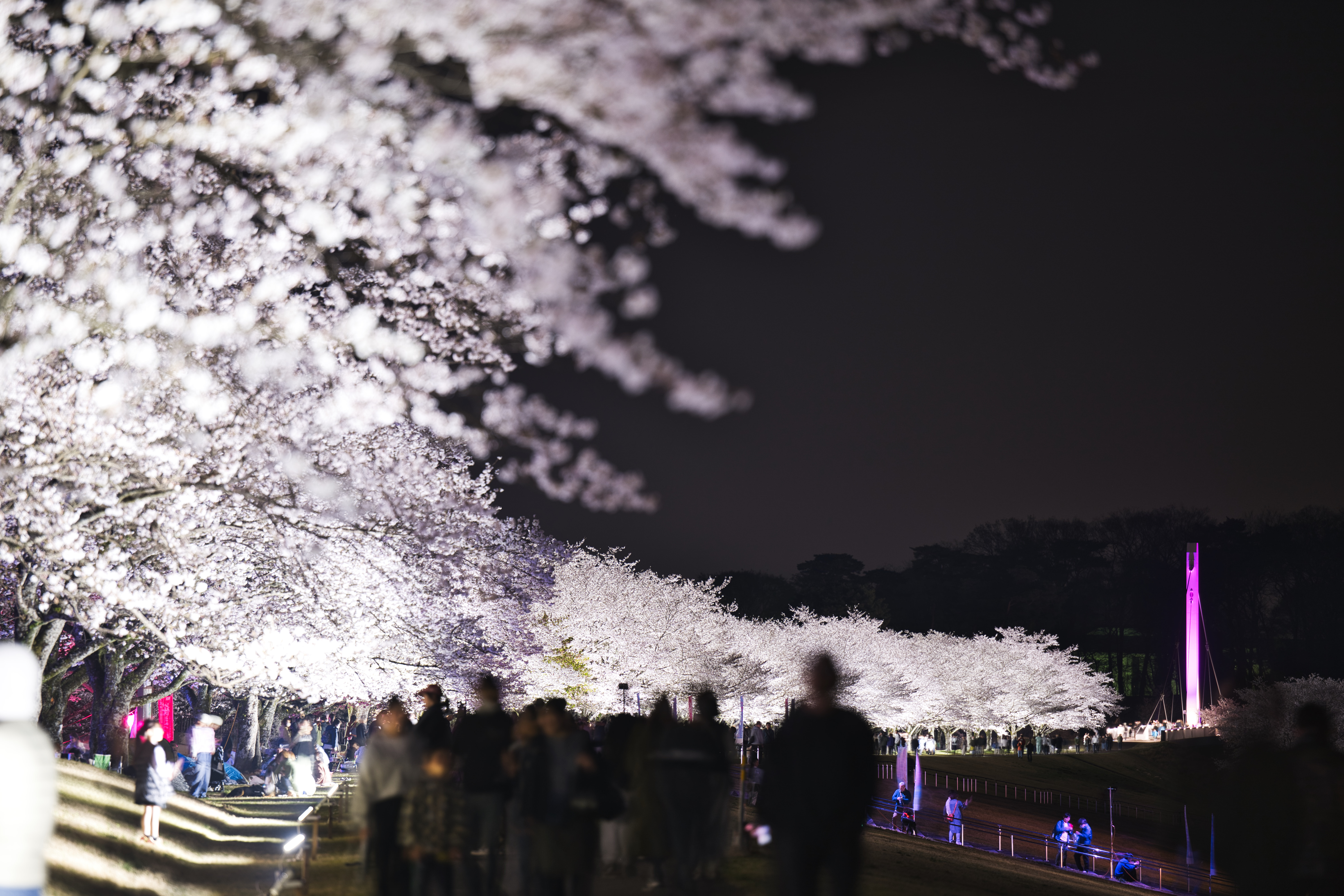 Illuminated Cherry Blossoms in Full Bloom at Night with Hanami Viewers