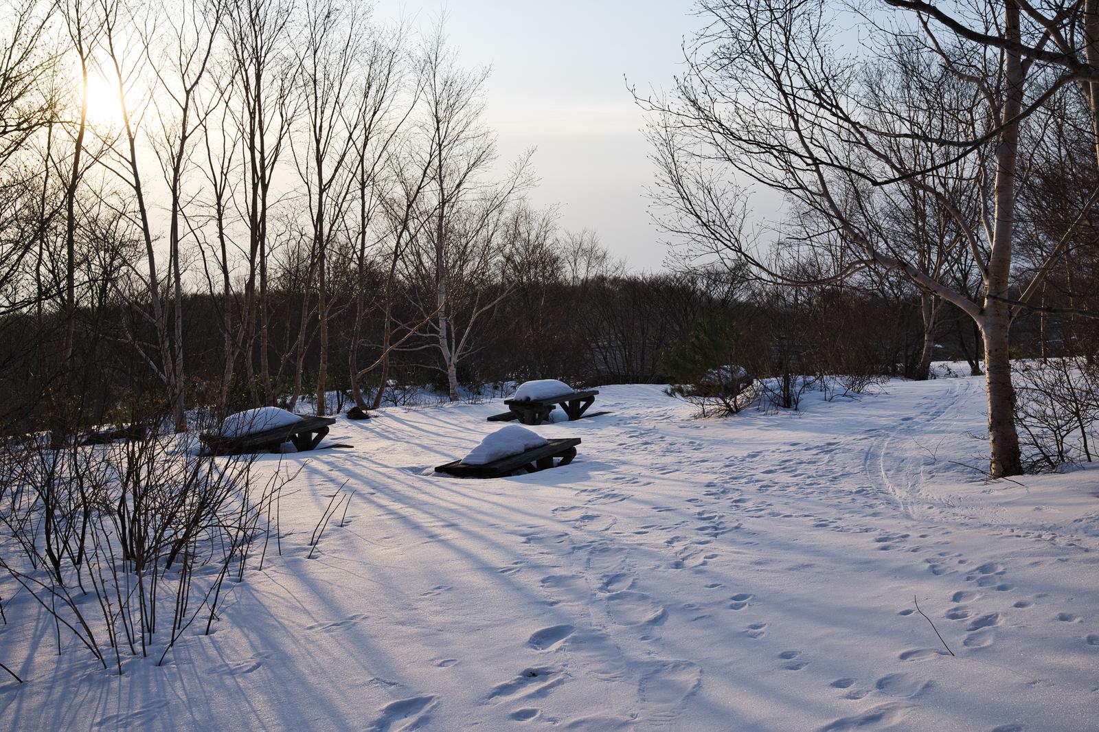 雪が積もったテーブルベンチの写真素材です。雪原に残る足跡と冬枯れの木立が広がっています。冬の自然をテーマにした記事や季節の背景素材などにおすすめです。