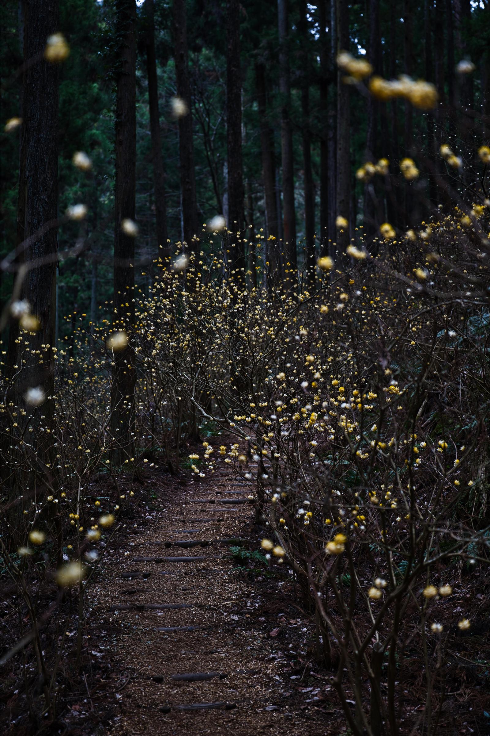 杉林の中に咲くミツマタの群生地と登山道の写真素材です。薄暗い森の中で黄色い花が登山道の両脇に連なって咲いています。早春の山歩きやハイキング情報の記事などにおすすめです。