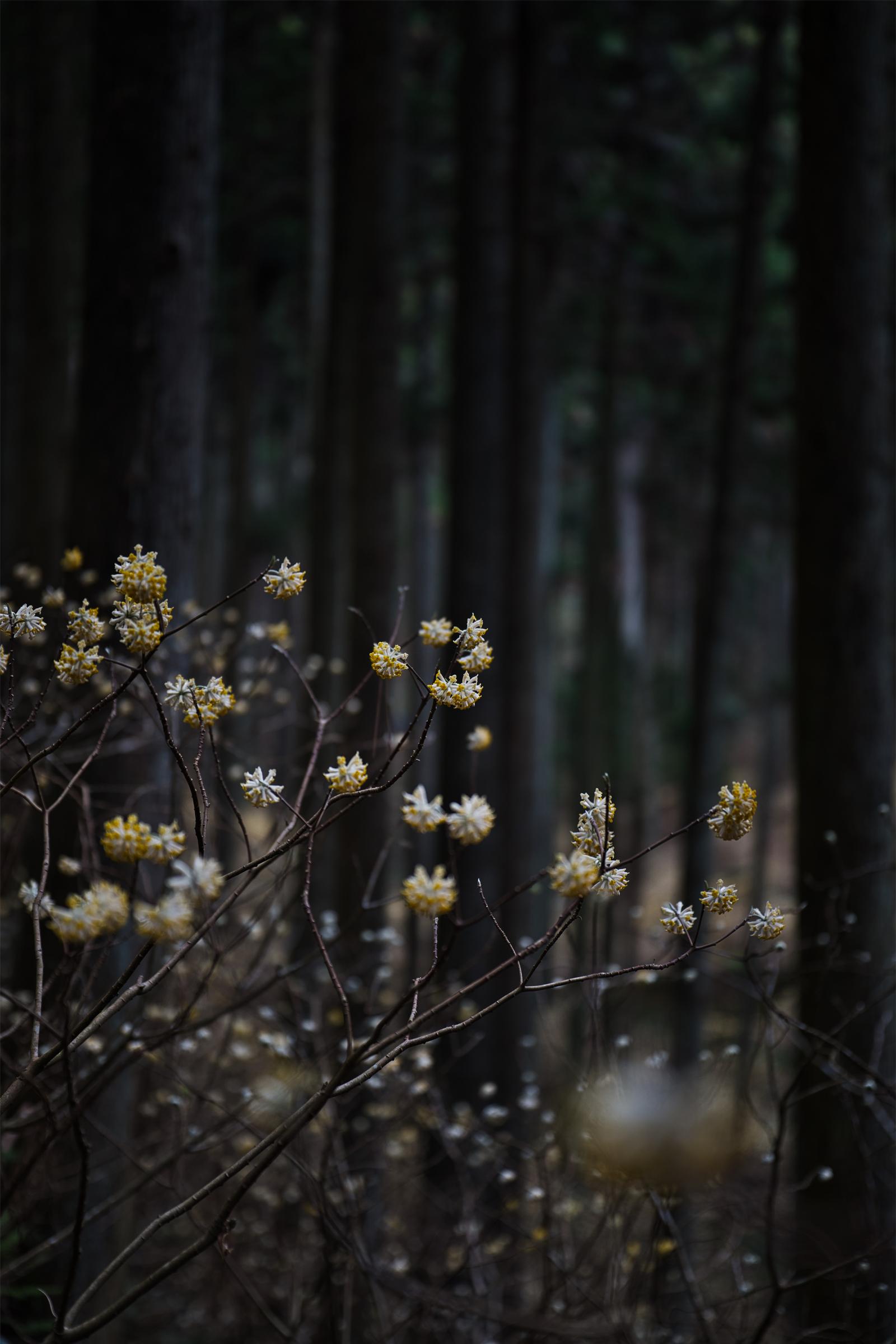 杉林の中に咲くミツマタの花の写真素材です。暗い森を背景に、白と黄色の小花が枝先に丸く集まっています。春の自然紹介や植物図鑑、季節のブログ記事などにおすすめです。