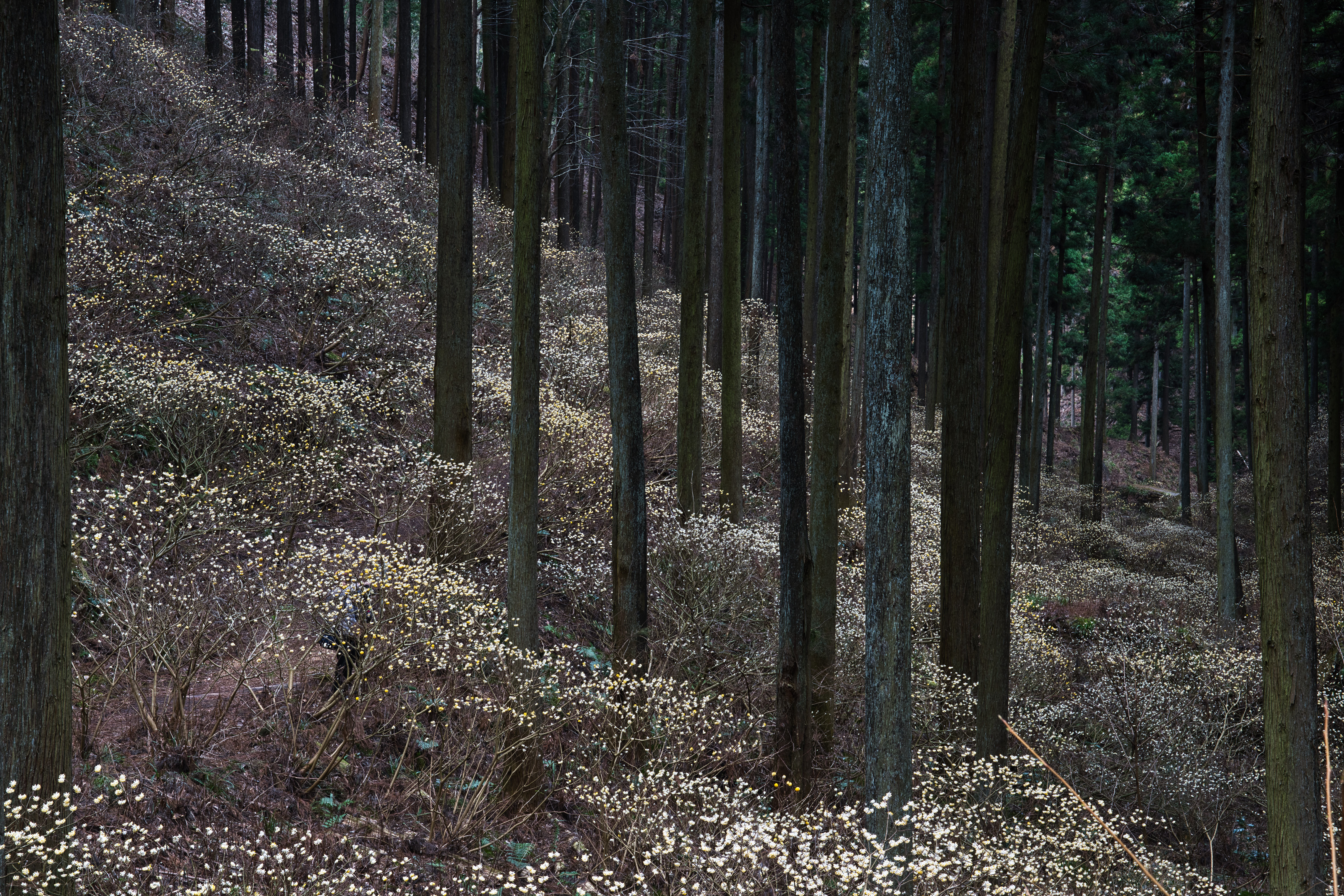 杉林の斜面一面に咲くミツマタの写真素材です。暗い杉の幹の間に白い小花が点々と広がっています。早春の山の風景や植物図鑑の挿絵などにおすすめです。
