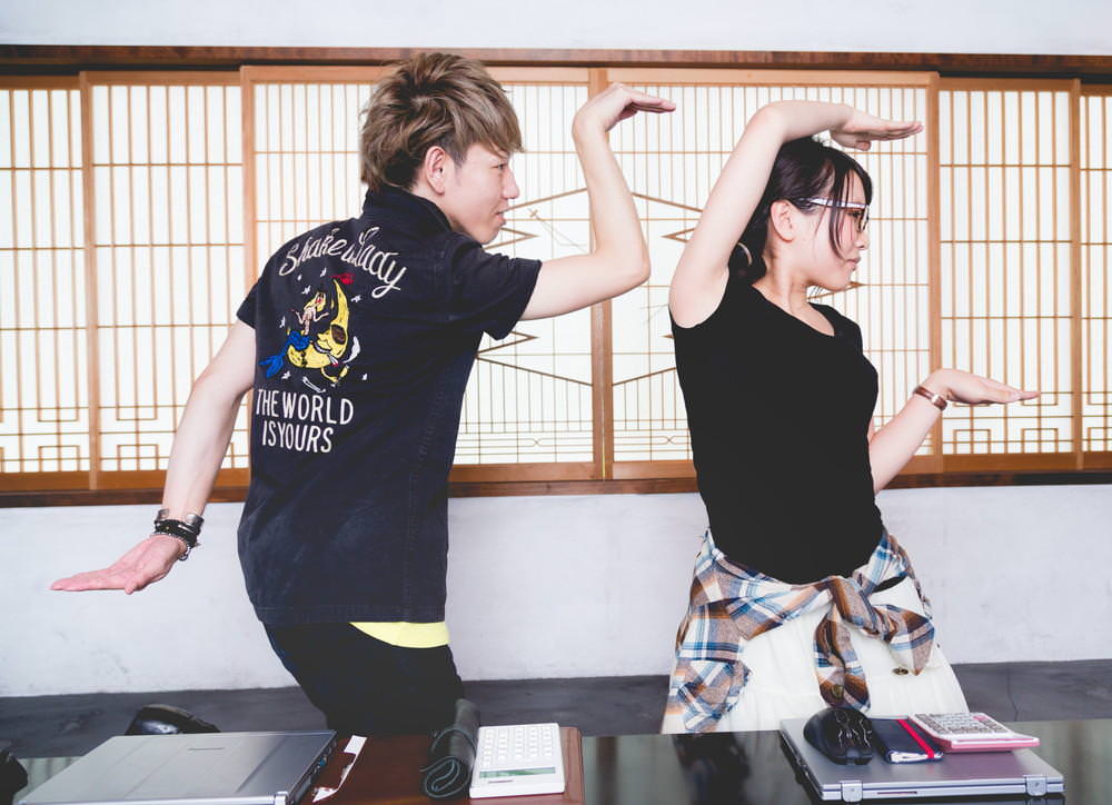 S・F (SAMURAI FACTORY)のポーズを決めてくれるノリのいいふたり。