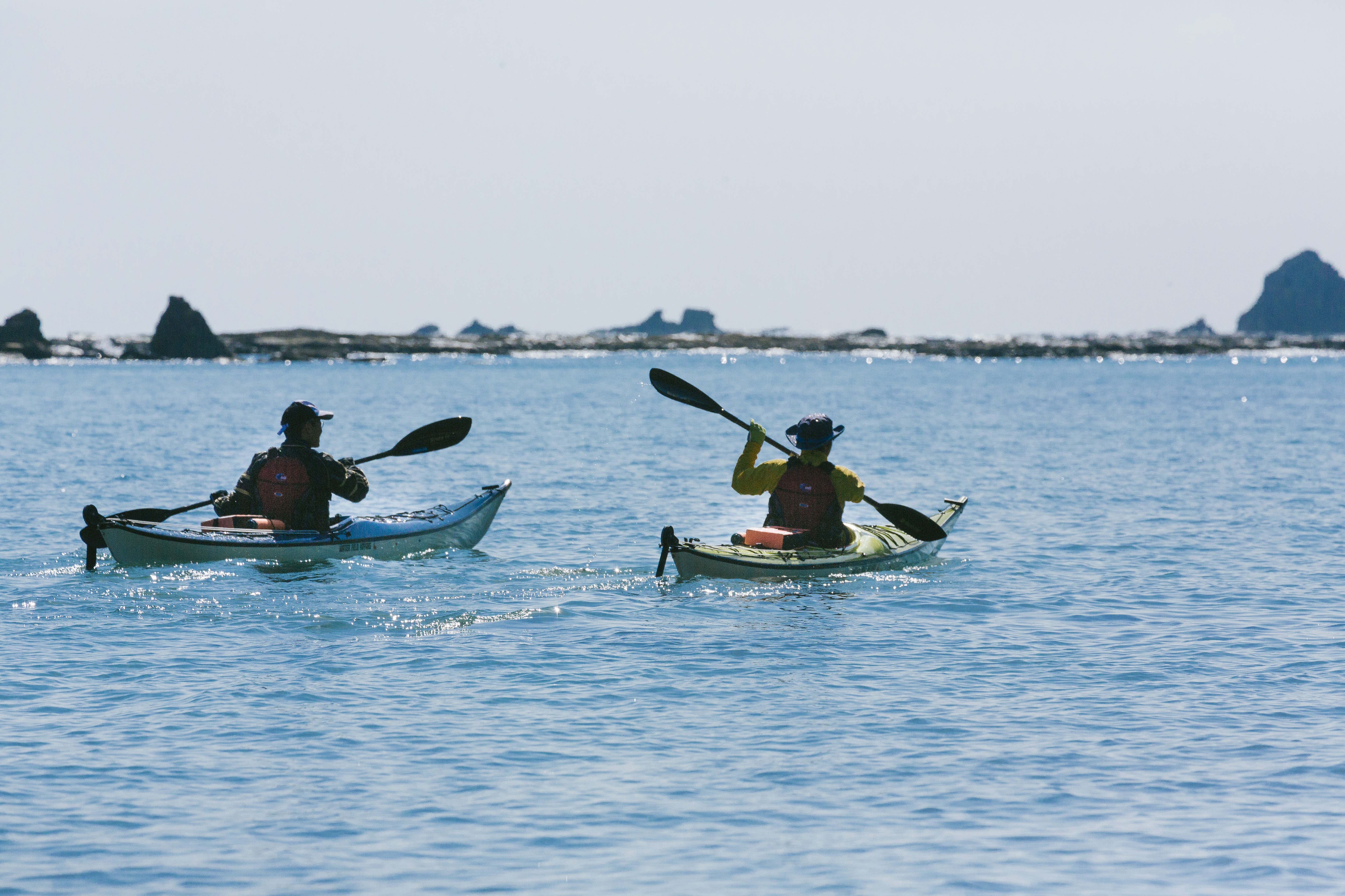 This is a photo of two people enjoying sea kayaking. They are paddling their kayaks on the calm surface of the blue ocean. This image would be suitable for tourism promotion, marine sports introduction, or activity experience advertisement.