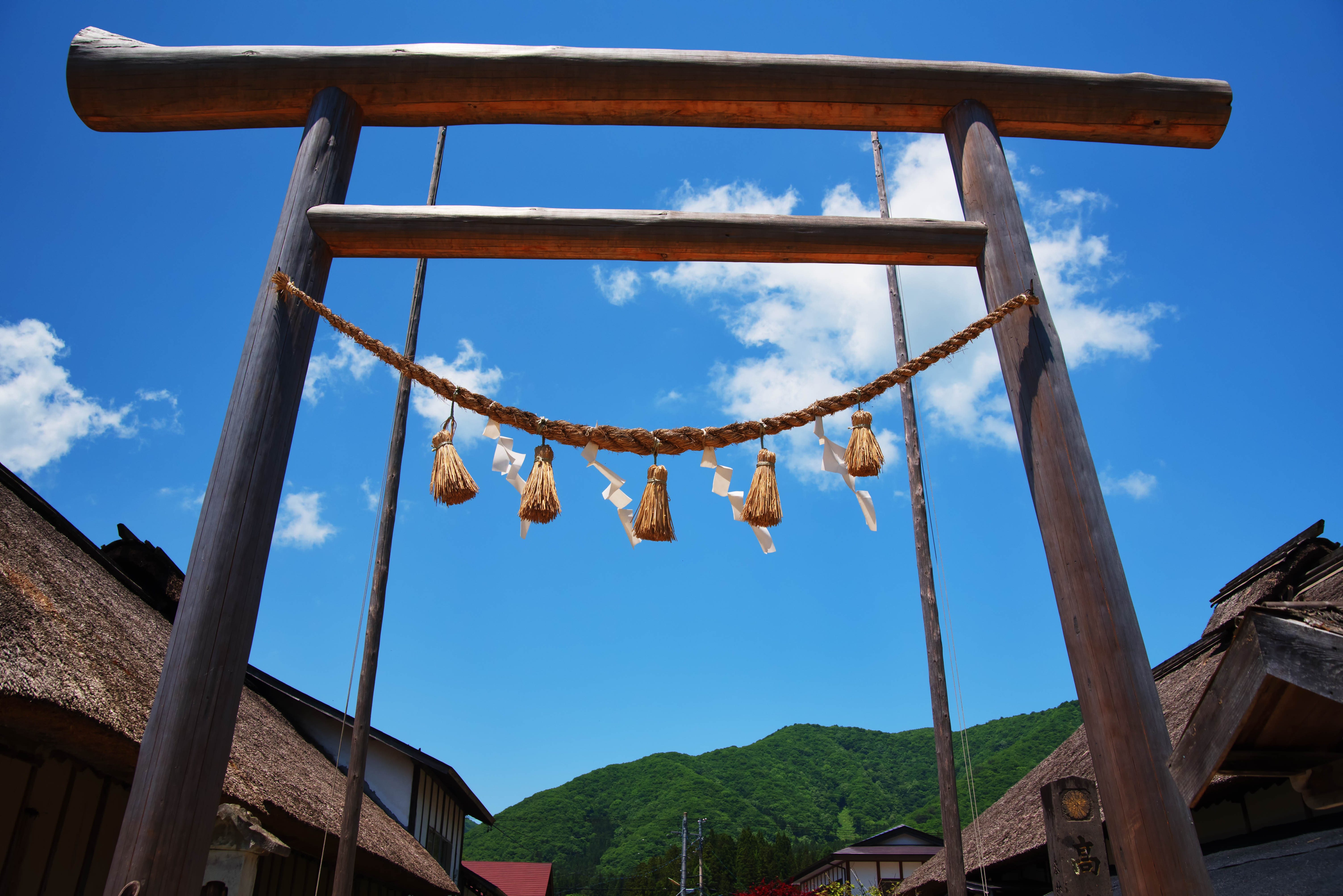 This is a photo of the torii gate at Ouchi-juku. Under the blue sky, a wooden torii gate stands on the road lined with thatched-roof buildings, and shide (paper streamers) hang from the shimenawa (sacred ropes).