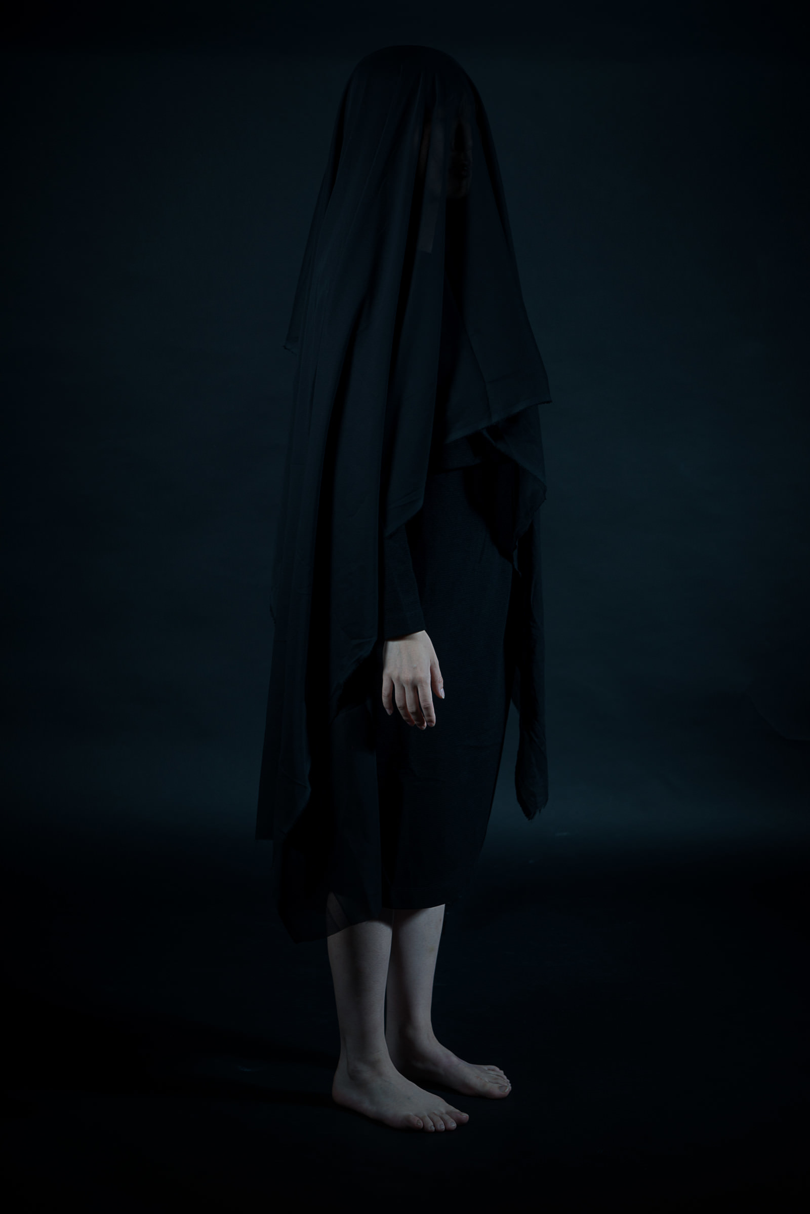This is a stock photo of a person who is confined under a cloth. The image depicts a person covered in a black cloth, standing in a dark space. This content can be recommended for suspense films, horror works, and content that requires psychological expre
