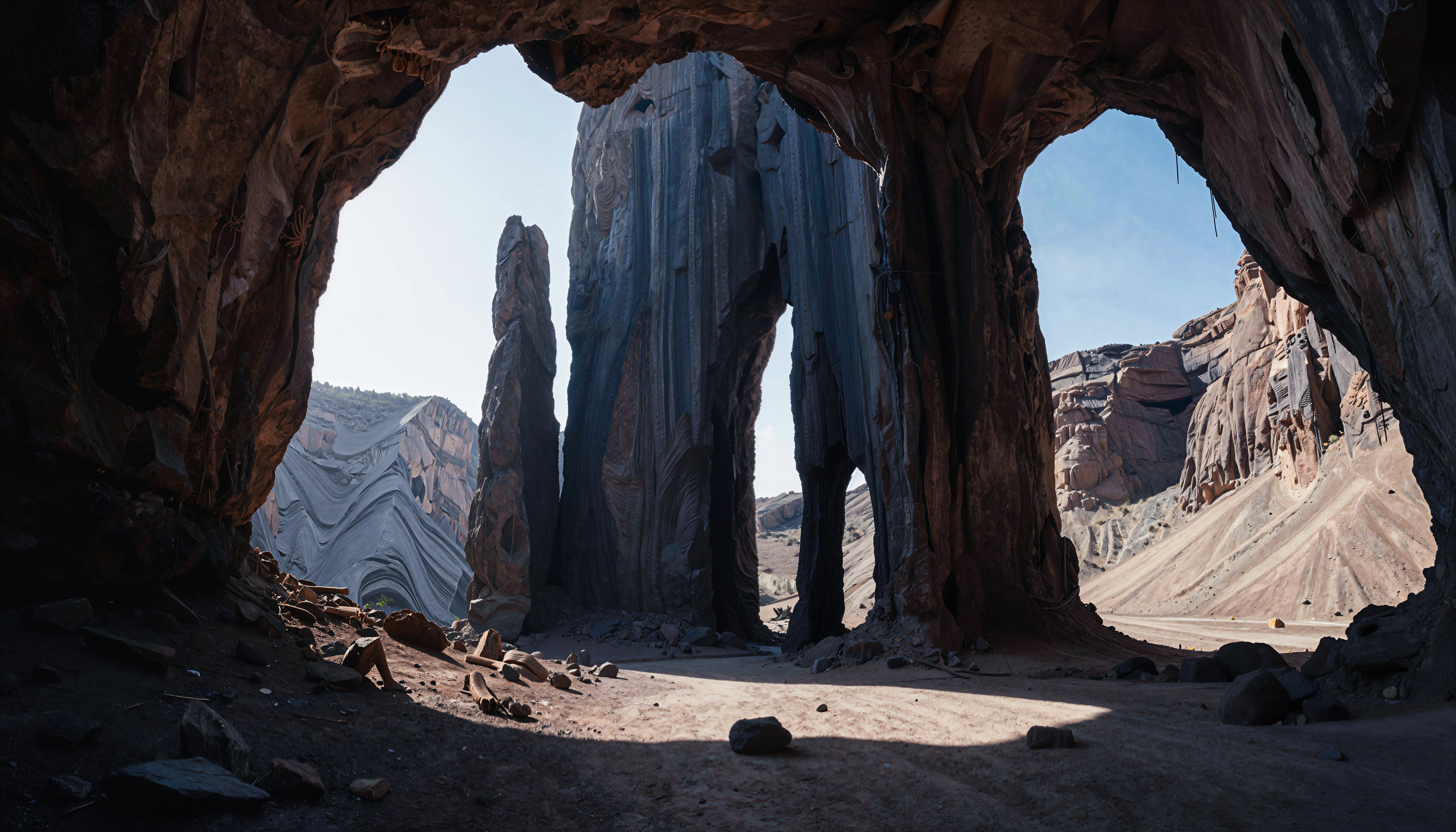 Interior of a Cave Surrounded by Columnar Jointed Rock Cliffs, Underground Space with a Cluster of Dark Brown Stone Pillars Free AI Image from Japan